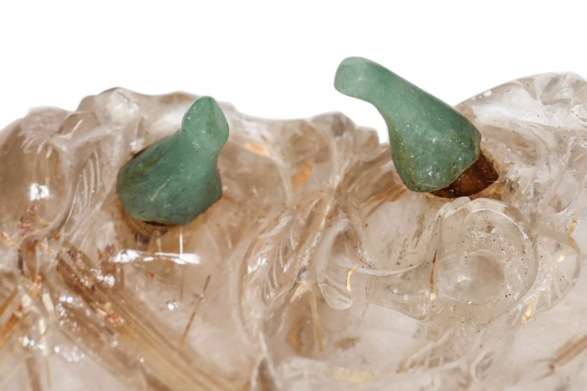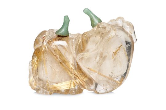 Transparent quartz with gold-toned needle inclusions, modelled as peaches on vine beside two auspicious bats, jade stoppers, 19th/20th century