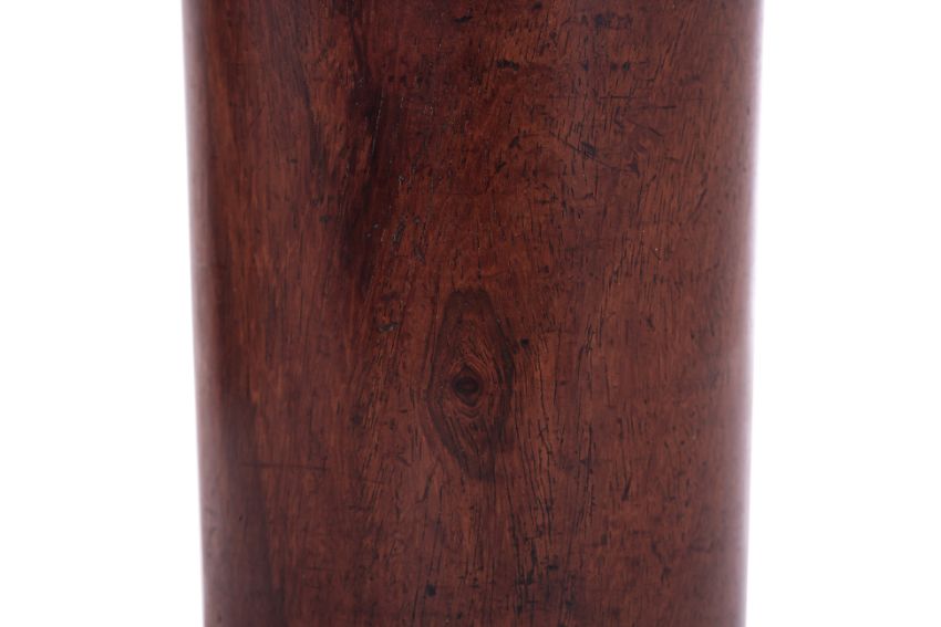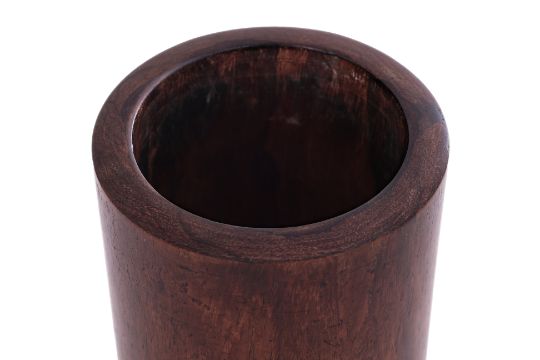 Cylindrical form with thick slightly flared sides, rounded rim and inset plug to base
