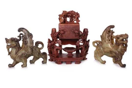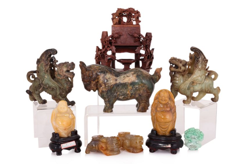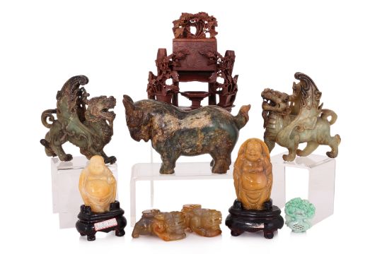Comprising: two yellow polished hardstone buddhas; a dyed jadeite plaque; a pair of agate mythical beasts; a foliate carved soapstone dispenser; a pair of jade winged mythical beasts; and a large jade model of a bull