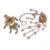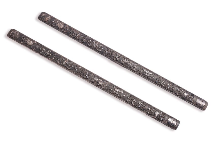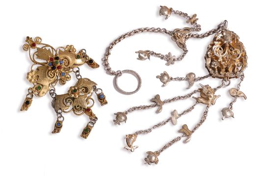 Qing dynasty, a silver-gilt butterfly and flower-form fragrance carrier on chain with tasselled charms, stamped character marks to side; a floret-link chain with peony basket spacers and three conical droplets to each end; a gilt-metal foliate brooch; and two Buddhist emblem decorated silver scroll weights (or flattened bangles) with two character mark to underside.