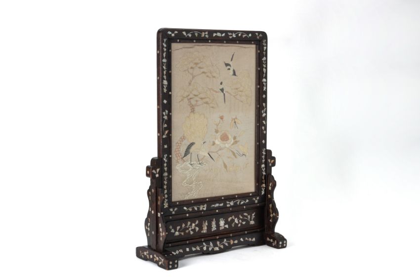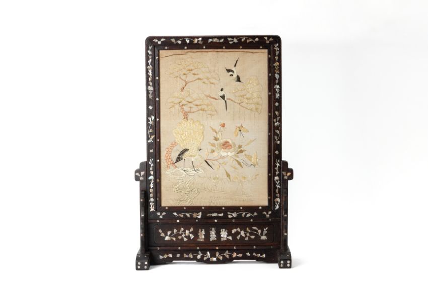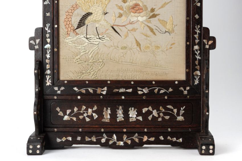 Decorated with peacocks, swallows and butterflies amongst flowering foliage, the frame inset with mother of pearl figures and scrolling floral motifs