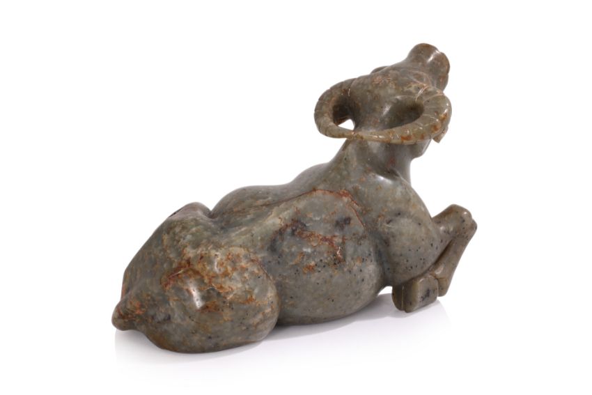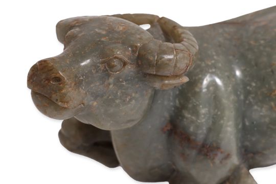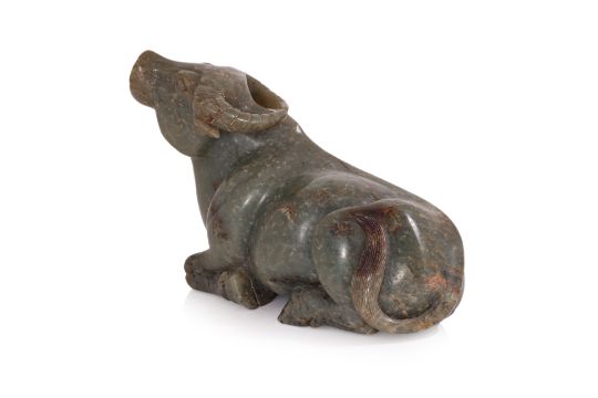 Dark-green jade with small russet toned areas, modelled as a buffalo seated with legs tucked under body and head looking upward