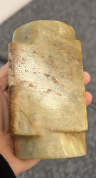 Celadon with beige and russet tones, cylindrical at ends with squared hollow body