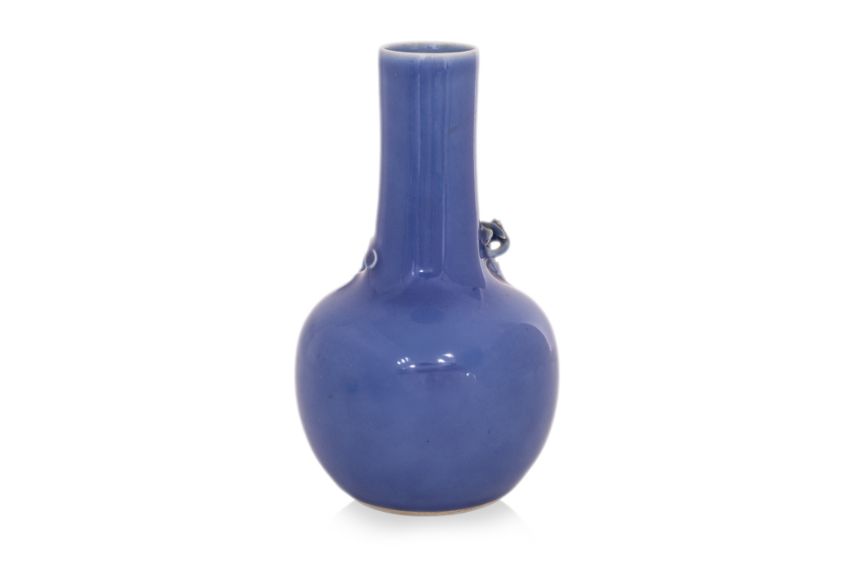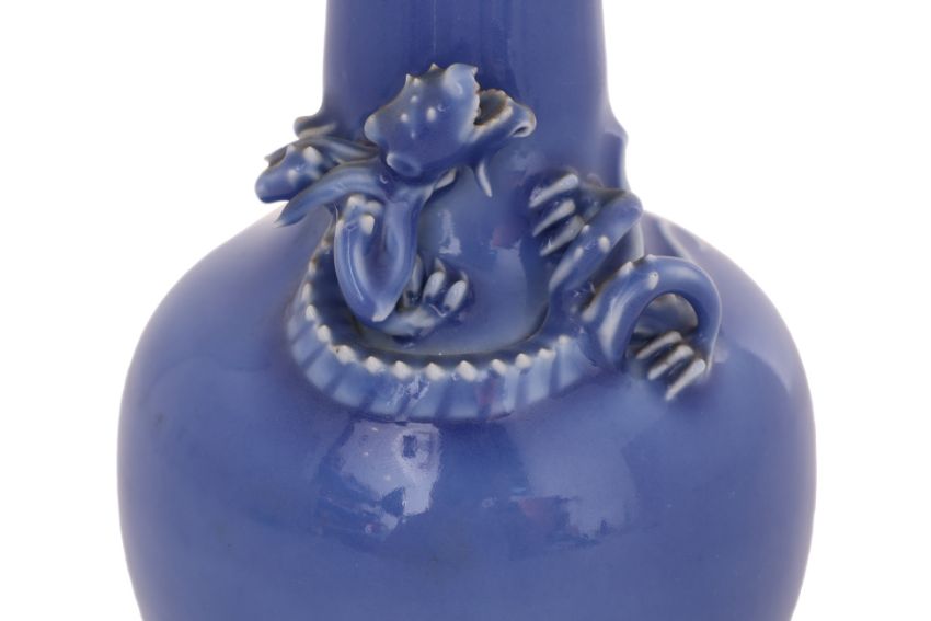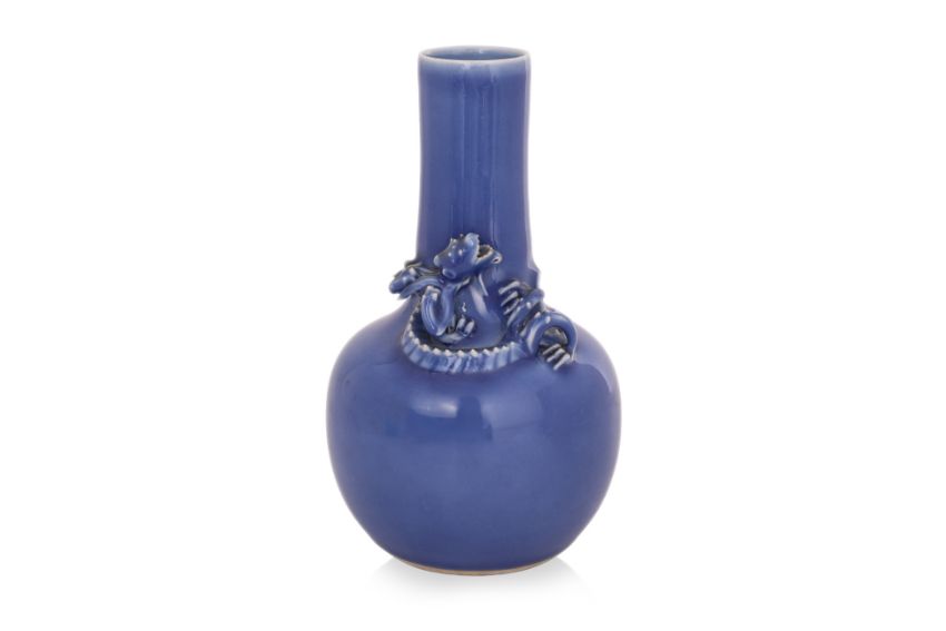 Globular body narrowing to the straight neck decorated with a sinuous coiled dragon, violet glazed thinning to the mouth, apocryphal Qianlong mark, Guangxu period