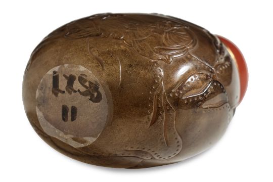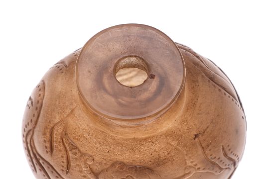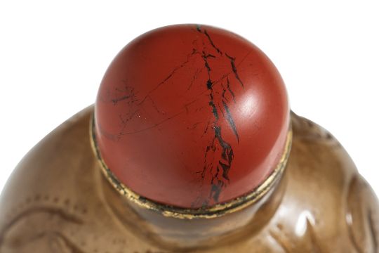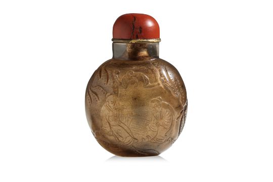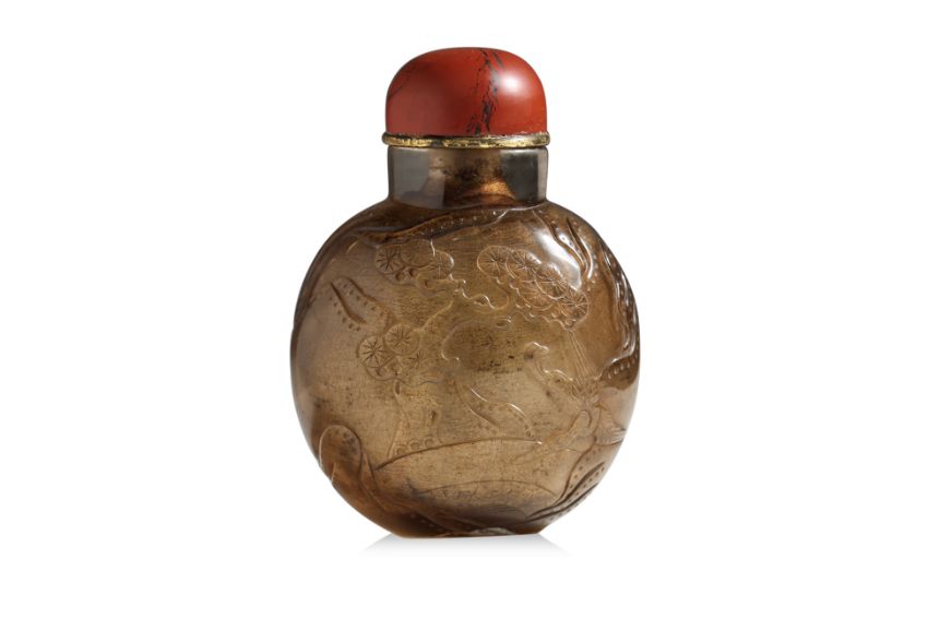 Of compressed spherical form decorated in continuous scene of two gentlemen playing board game with a bat flying overhead, the reverse showing a crane swooping under a pine tree, very well hollowed interior, slightly concave oval base, jasper stopper, 18th/19th century