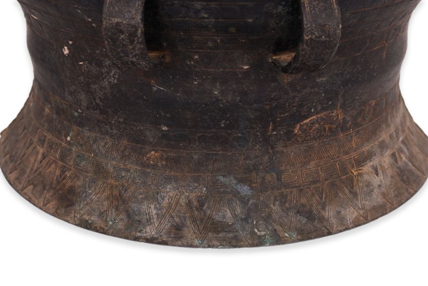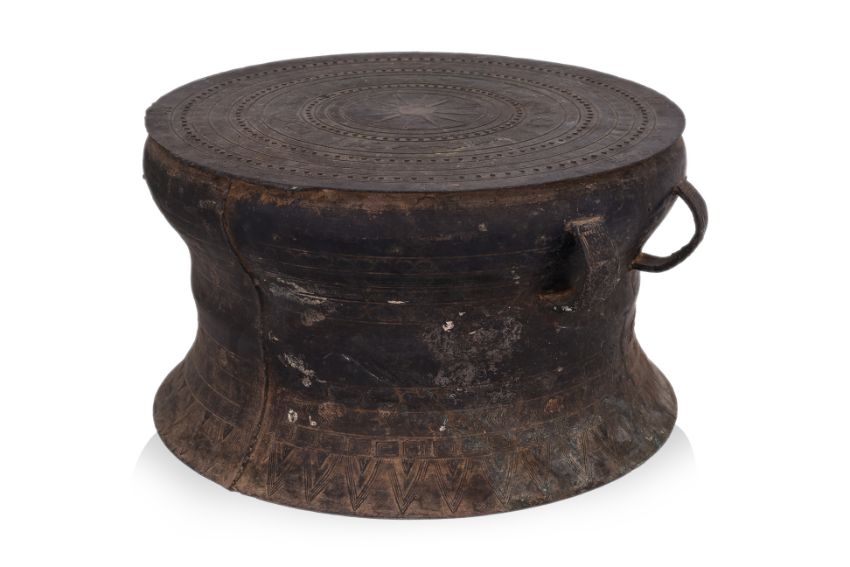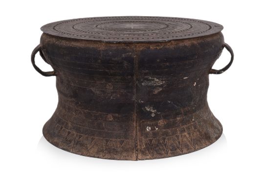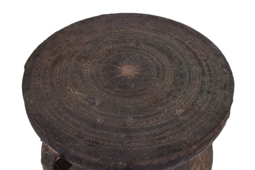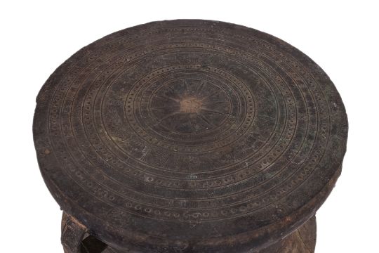 19th Century or earlier, circular form with waisted sides, two loop handles to each side, the top decorated in central 12 ray star bordered by animals, mythical beasts, and geometric bands, the sides with similar geometric patterns