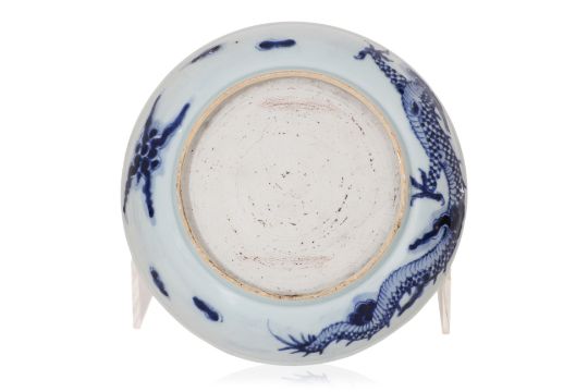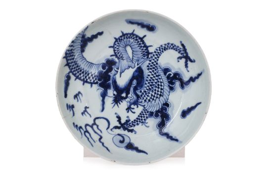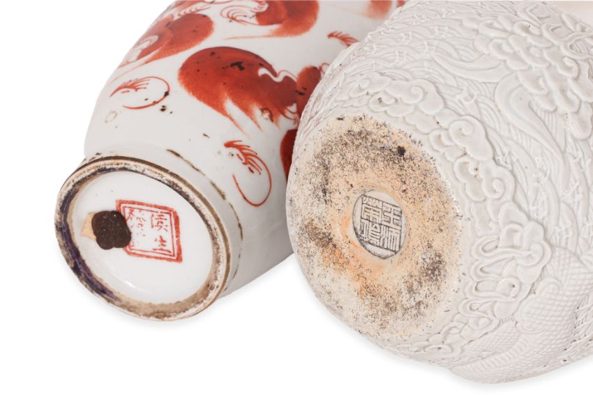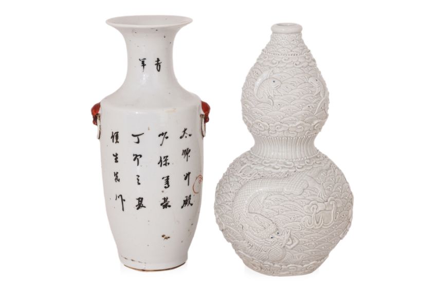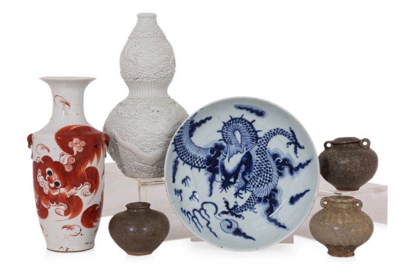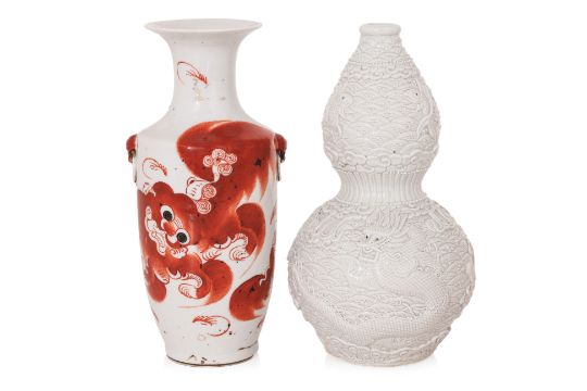 Comprising: an iron red decorated foo dog vase, with twin handles and inscribed with calligraphy, mid-20th Century; a blue and white dragon dish, 19th Century; a relief moulded blanc de chine double gourd dragon vase, moulded Wang Binrong seal mark to base, 20th Century; and three Ming celadon jarlets