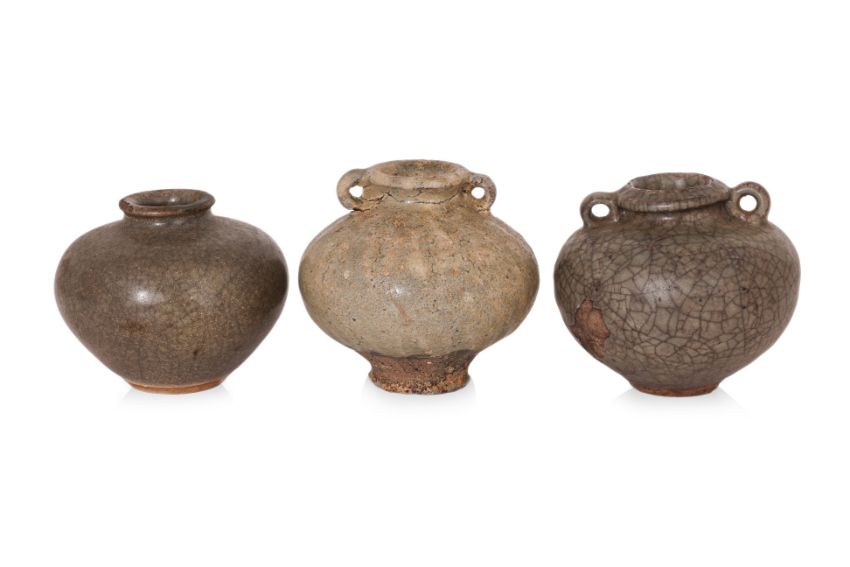 Condition Information: The blue and white dish with two hairlines to the rim and some fritting to rim; the celadon jar with twin handles has an area where the glaze has flaked off; the plain jar with some similar loss around the mouth rim; the third jar with some extensive glaze wear and firing faults