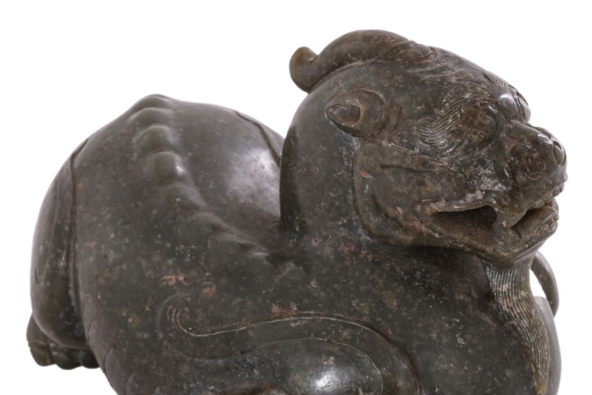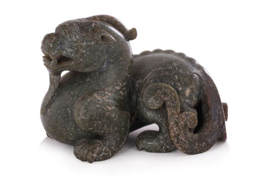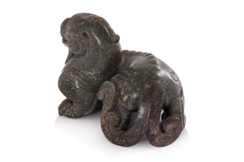 Dark green and russet toned jade, modelled as a hunched feline figure