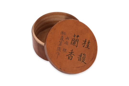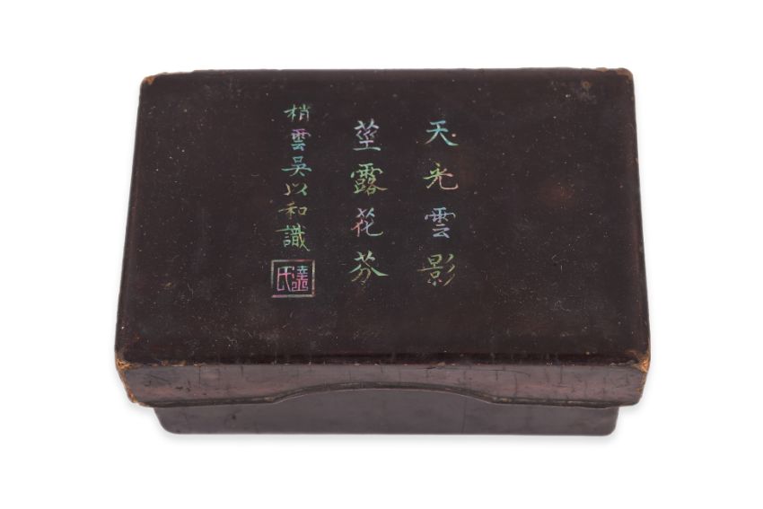 A rectangular black lacquered box with mother of pearl shell inset poem to cover, 'skylight and clouds, stem dew flower fragrance, shaoyun wu yihe, knowledge follow', a circular box with inscribed cover, and a rectangular box with landscape scene