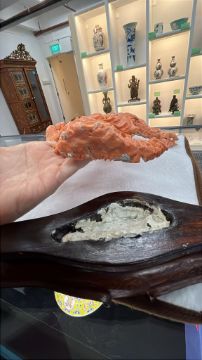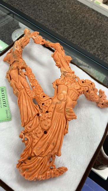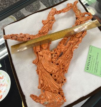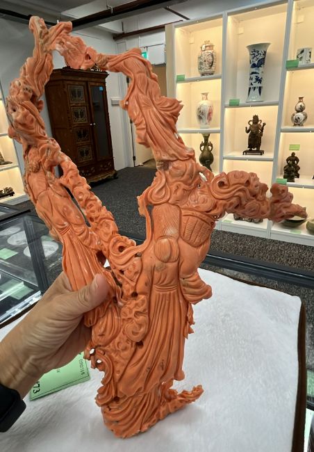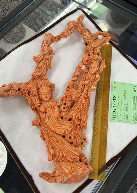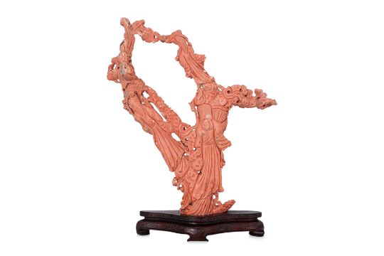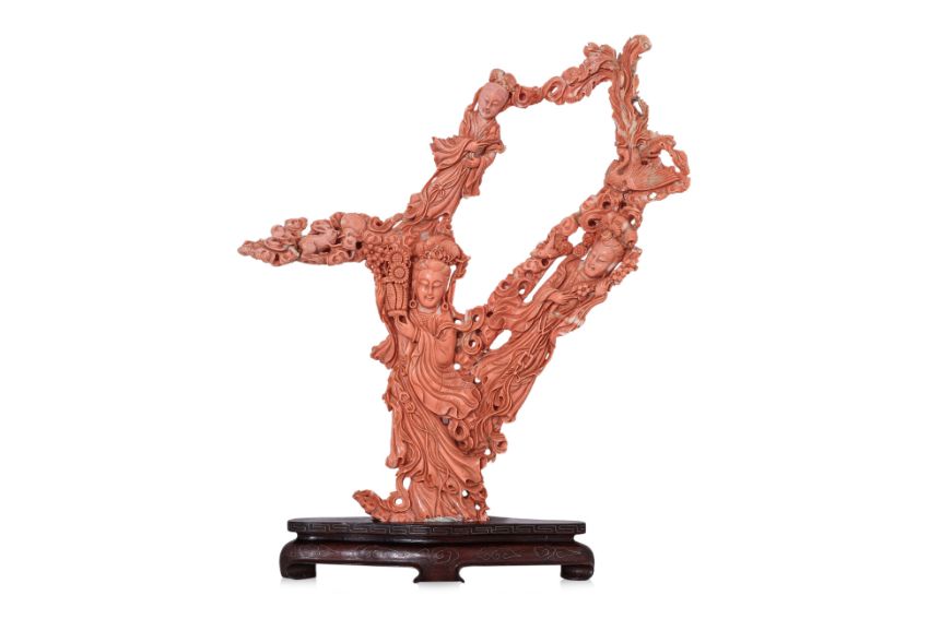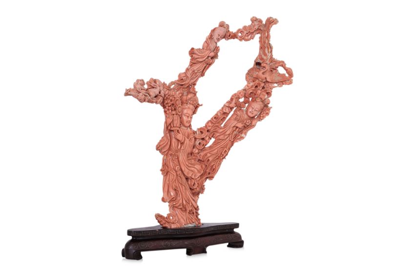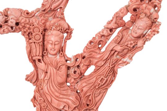 A LARGE CORAL CARVING OF THREE GUANYIN
