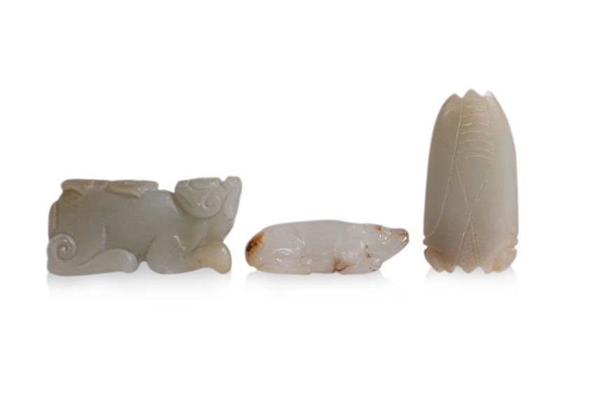 A GROUP OF THREE CELADON JADE CARVINGS (2)