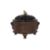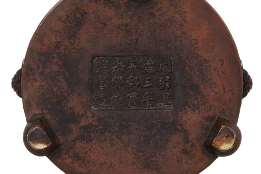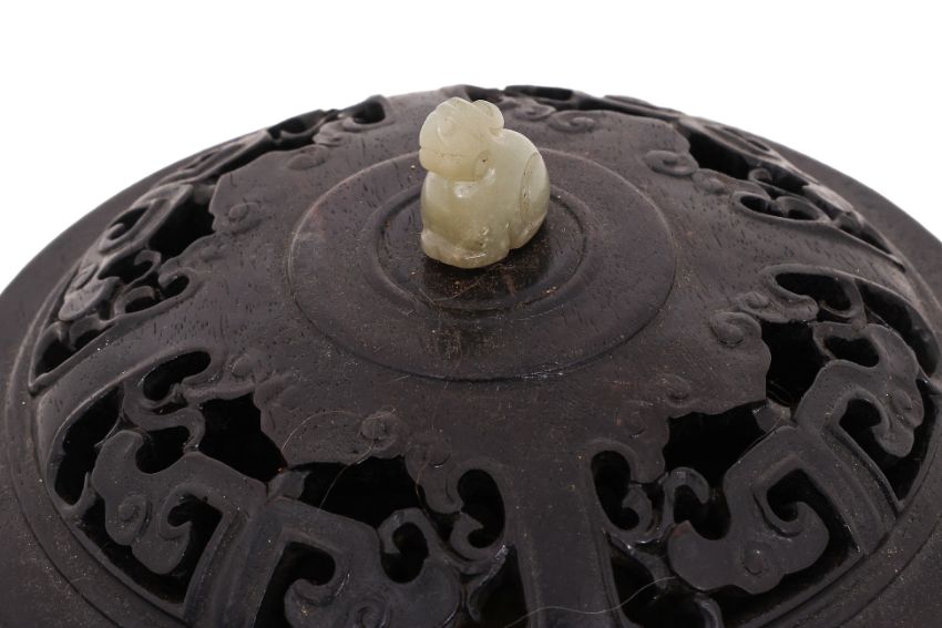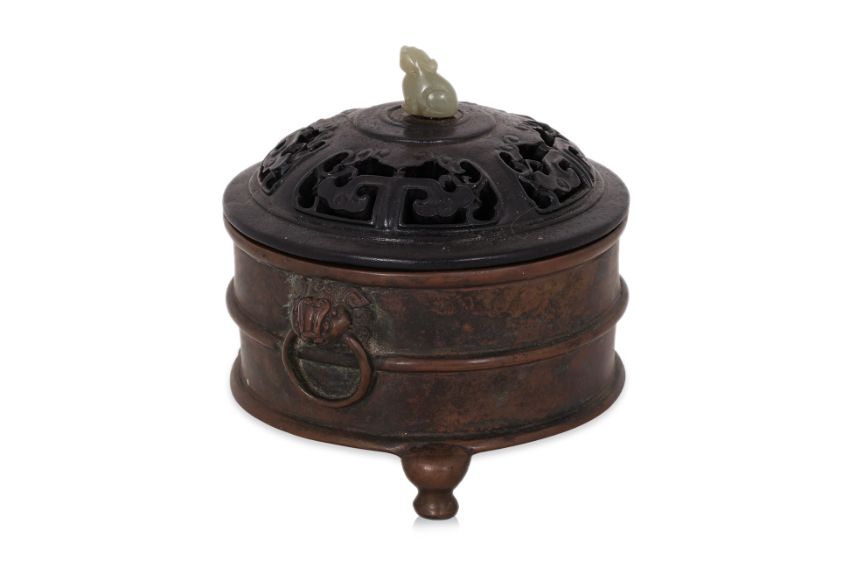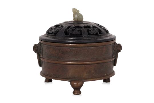 Circular censer with banded sides and archaistic figural ring lugs, reticulated hardwood cover with jade finial, standing on three bulbous curved feet, apocryphal Xuande marks to base