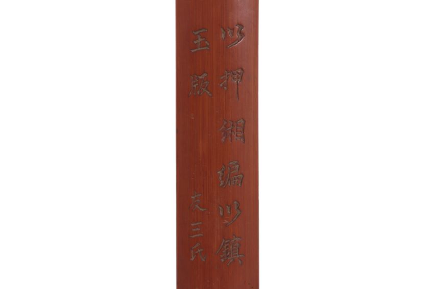 Decorated in relief carved pavilion with phoenix, bamboo trees and fish, a qilin to the reverse, together with a rectangular inscribed wrist rest