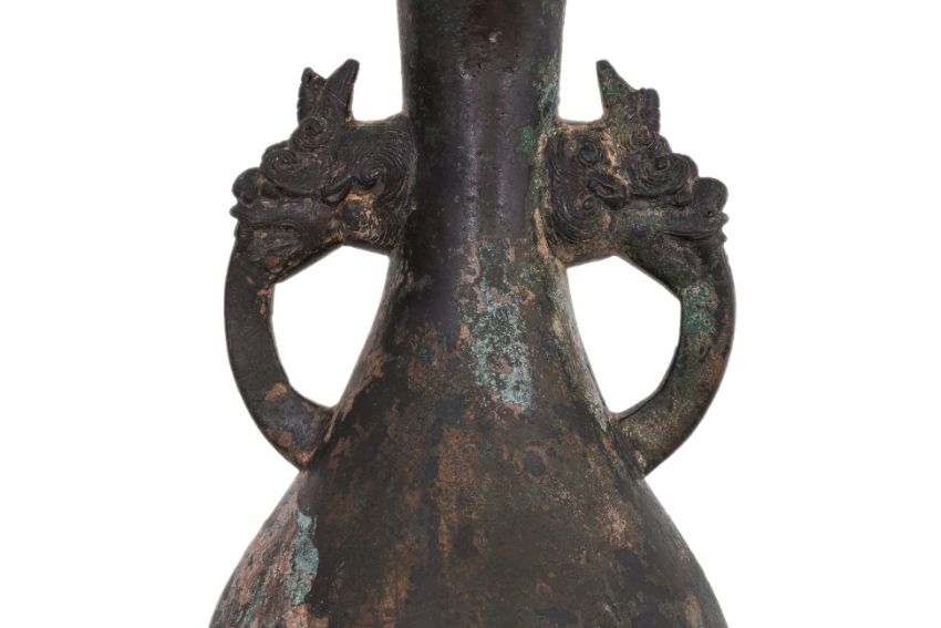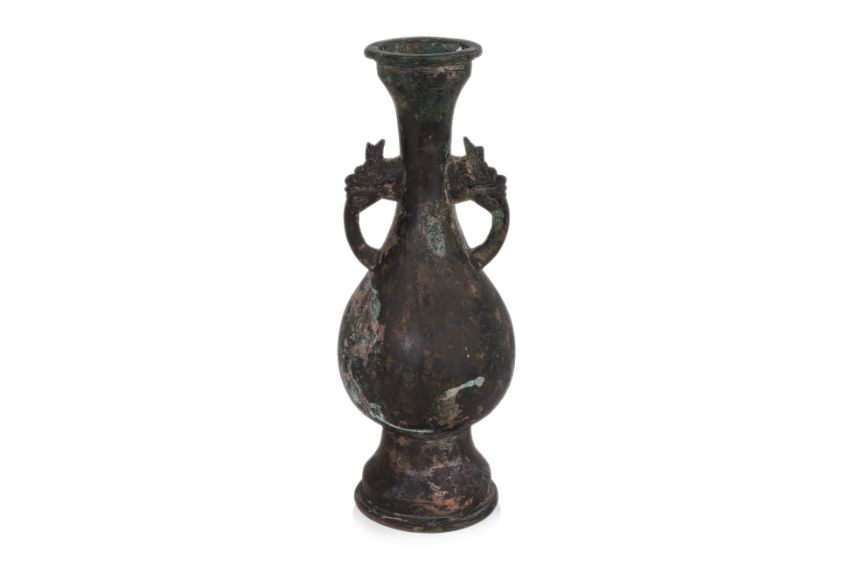Yuan style vase with rounded body and waisted neck, a pair of dragon handles, ridged mouth and foot rim