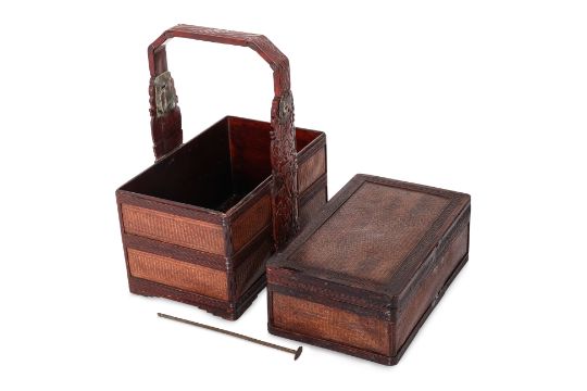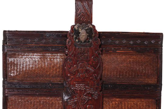 The handle carved with an immortal and bats to each side, the upper tier held in place with a metal slide, woven panels and key fret borders