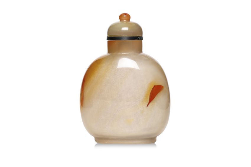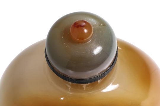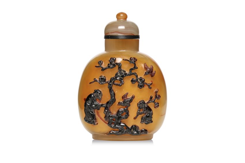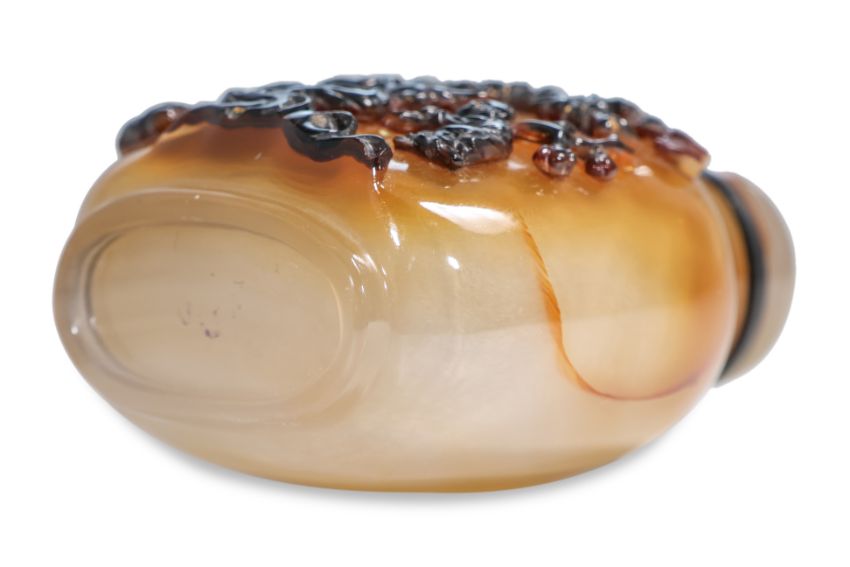 Amber, grey and dark brown chalcedony, compressed ovoid form, decorated in relief carved scene of gentleman with attendant boy under a plum blossom tree, a perched bird and another flying overhead, well hollowed interior, 19th/20th century