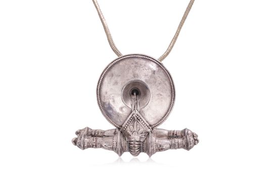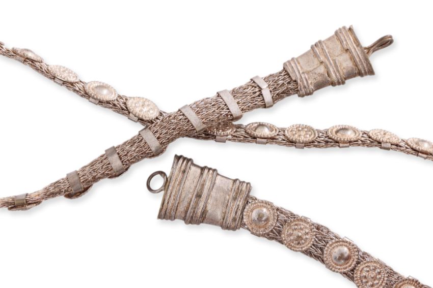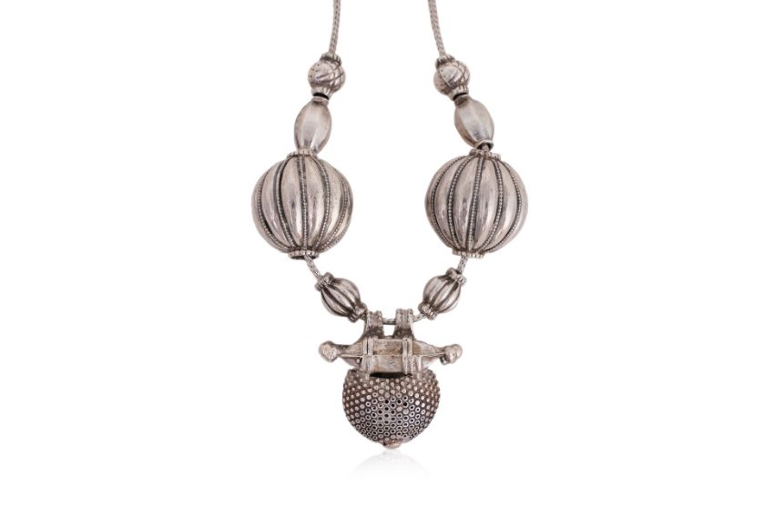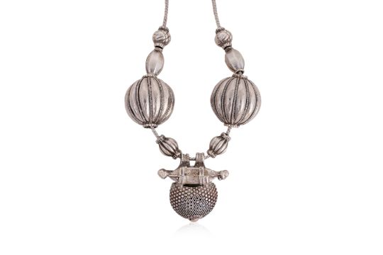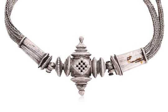 A Rajastani double snake-link chain with floret bands and cross-form screw clasp; a longer silver mesh belt held together with circular bands; a snake-link chain with large Gujarat akota pendant; and a smaller necklace with silver beads and similar akota pendant