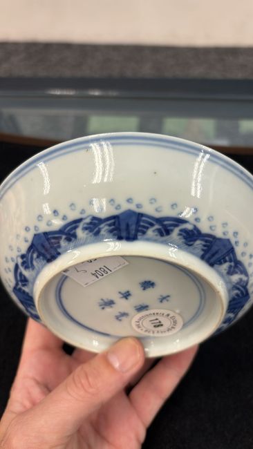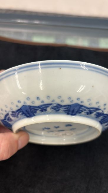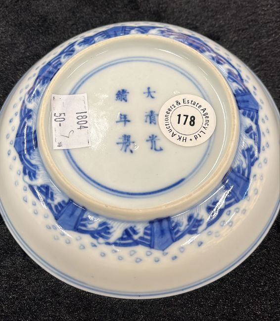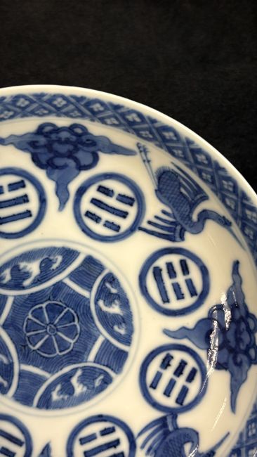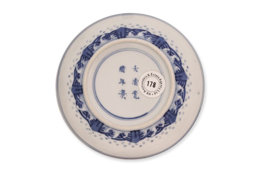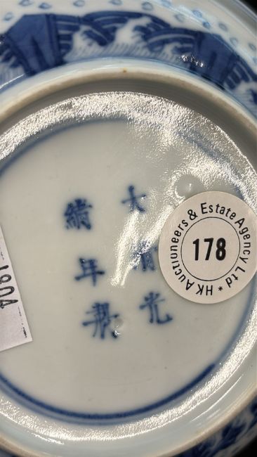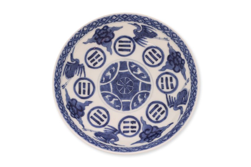 Guangxu mark and believed of the period, decorated with eight trigram circular reserves, flying cranes and clouds around a central medallion of crashing waves, and a diaperwork border to the rim, the exterior with a border of crashing waves and rocks