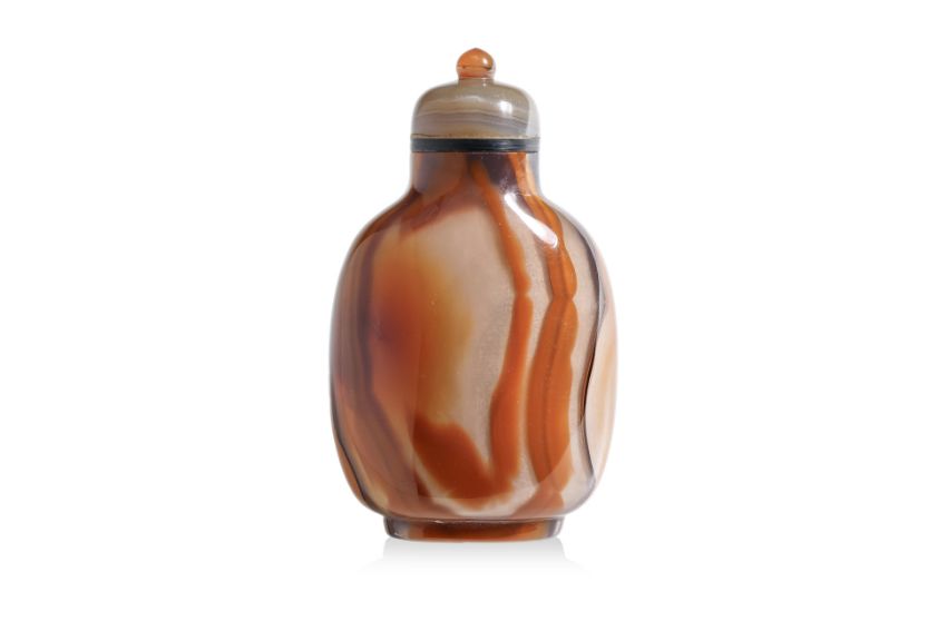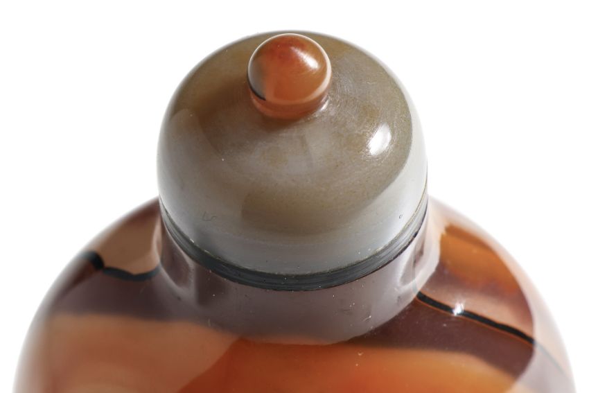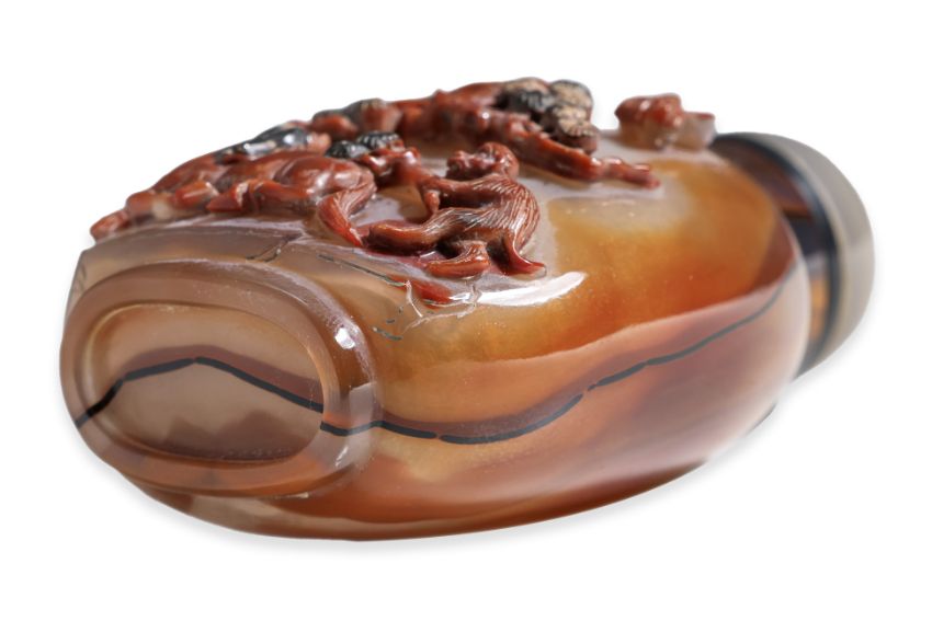 Semi-transparent grey and honey-brown banded agate, compressed ovoid form with well hollowed interior, decorated in deep relief carved scene of monkey and horse under a pine tree with a bee flying above, undecorated polished reverse showing naturalistic bands, agate stopper, probably 19th century