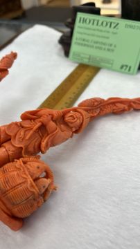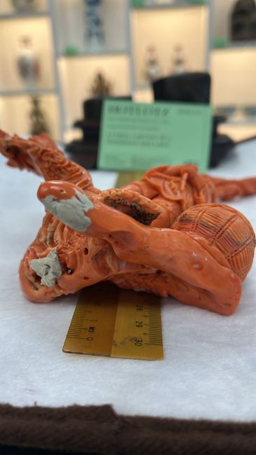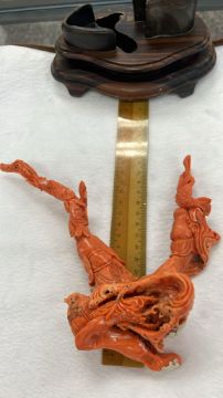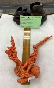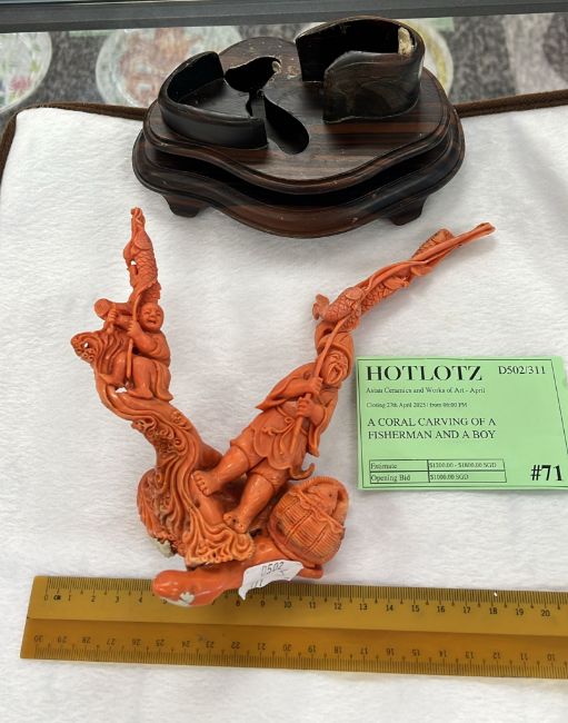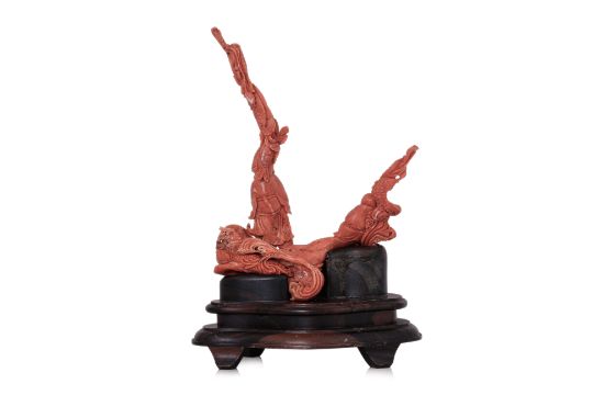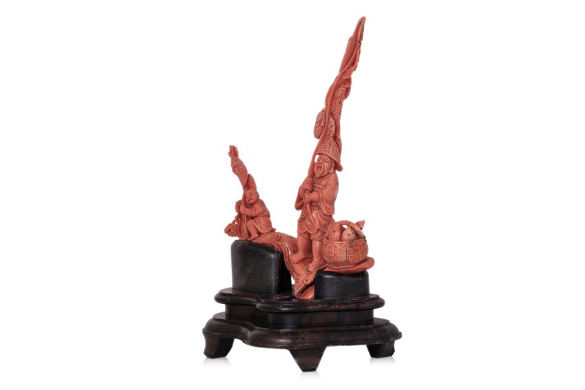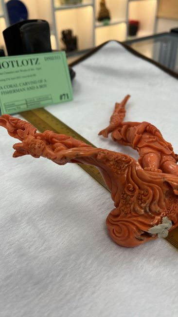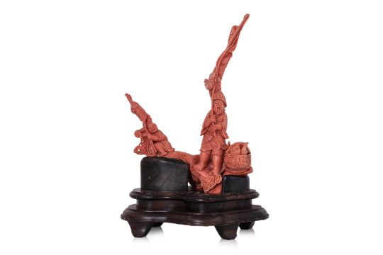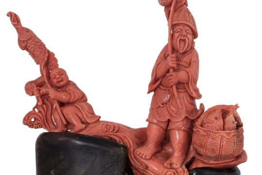 A CORAL CARVING OF A FISHERMAN AND A BOY