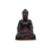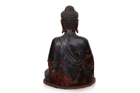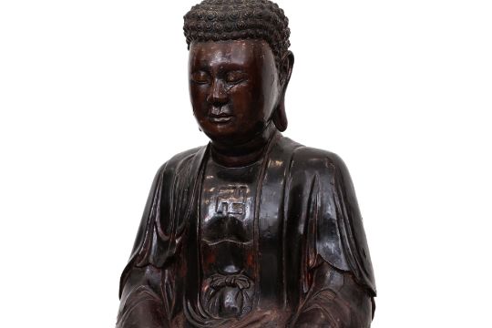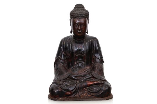 19th Century, lacquered and gilt wood statue of Buddha seated in padmasana and hands held in dhyana mudra, elongated earlobes and hair curling to the right, moulded symbol of auspiciousness to the chest, hollow interior and standing on wooden base