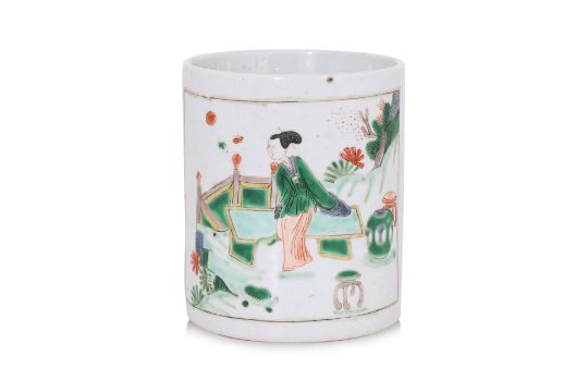 Probably Kangxi, cylindrical brush pot decorated in panelled scene of lady in garden, the reverse panel of a lotus pond.