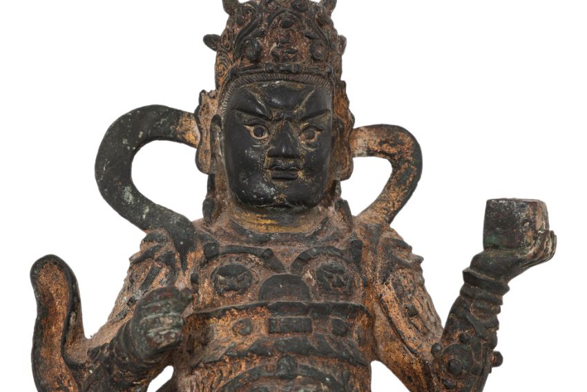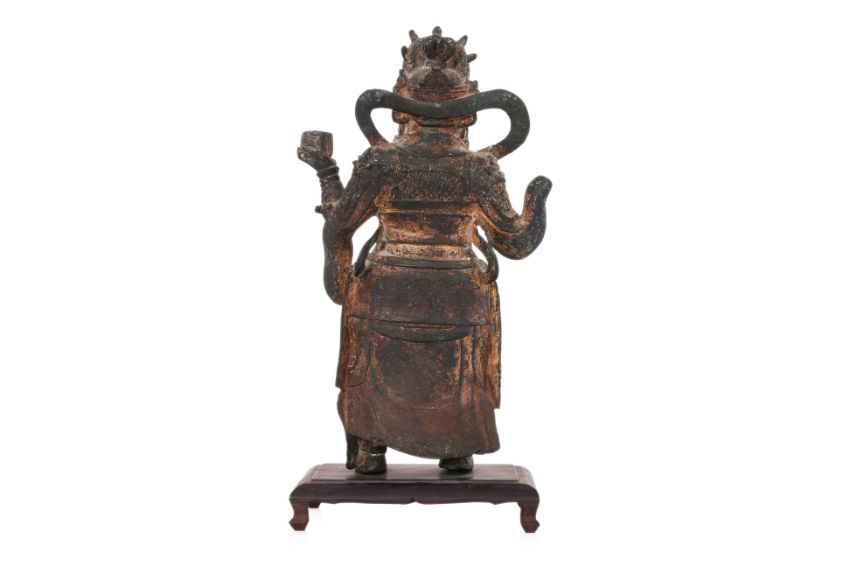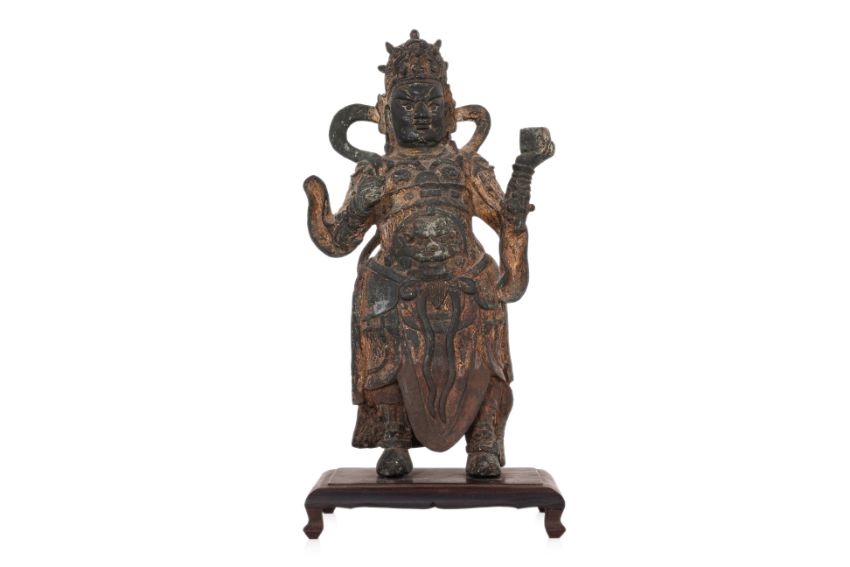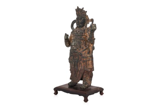 Modelled standing wearing armour, a floating celestial scarf, and a Buddhist type crown, his left hand raised holding an attribute, his right fist clenched as if to hold his polearm, extant gilding to areas, late Ming dynasty, circa 16th/17th century, with later fitted hardwood stand