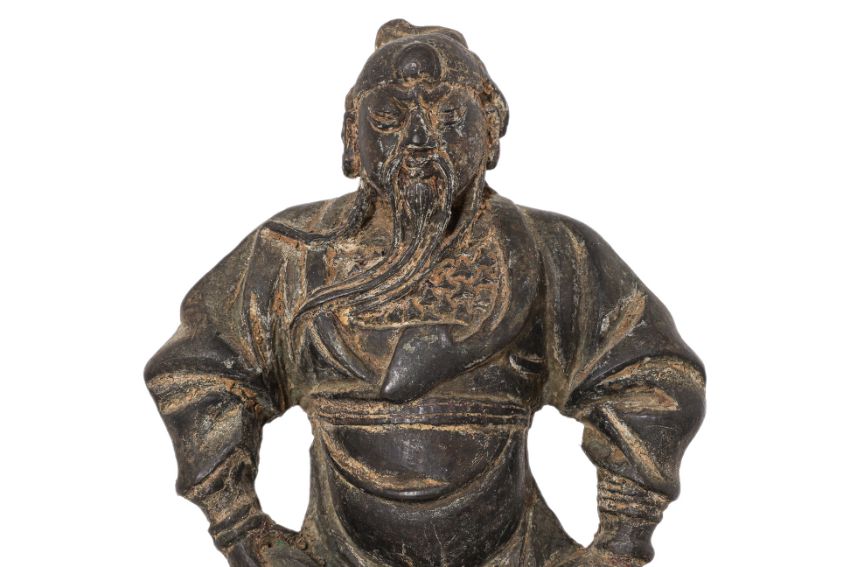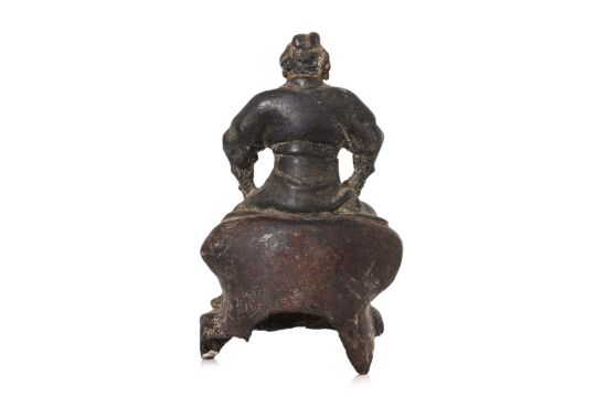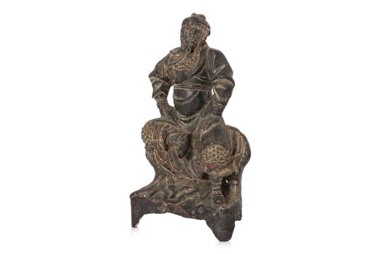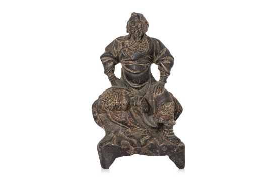Modelled wearing armour and seated on throne, hands at hips and one foot raised, the other rested on tiger rug, with extant traces of lacquer, late Ming dynasty 16th/17th century