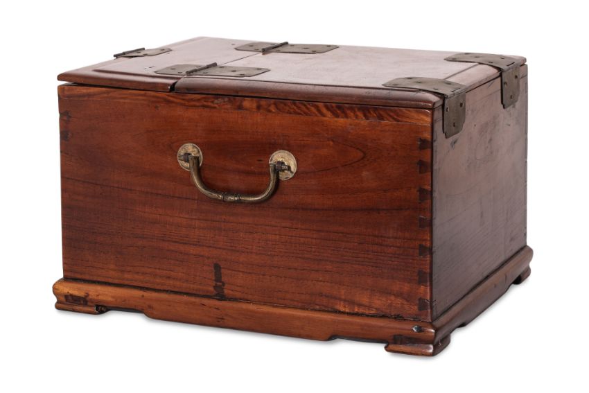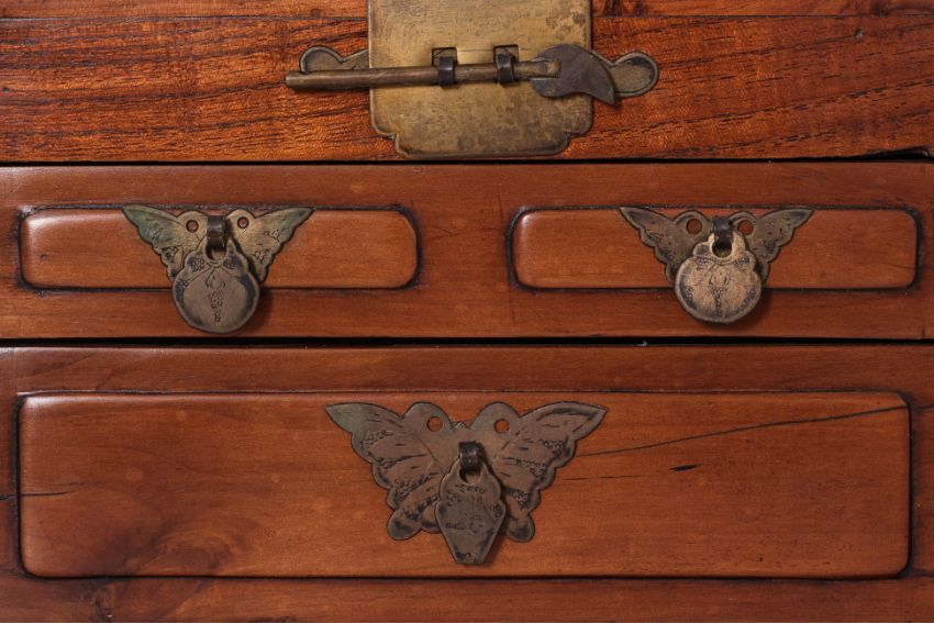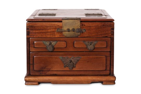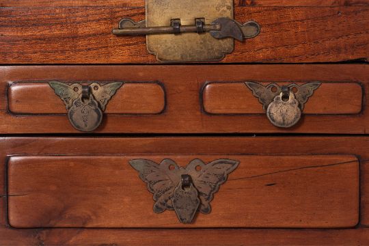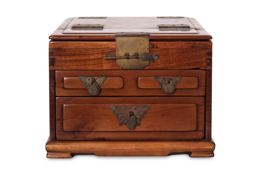 Twin carrying handles, the hinged cover enclosing a foldable mirror, the front with three small drawers with butterfly escutcheons