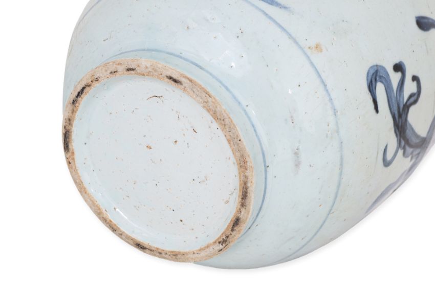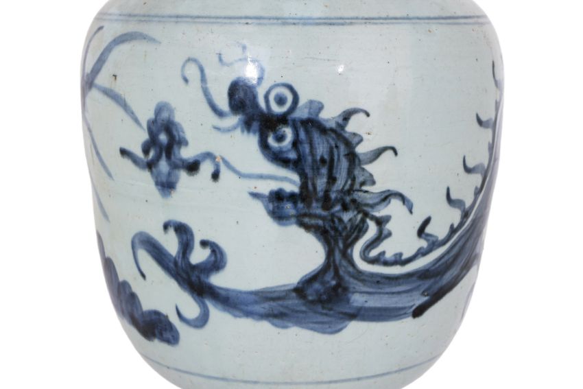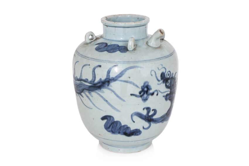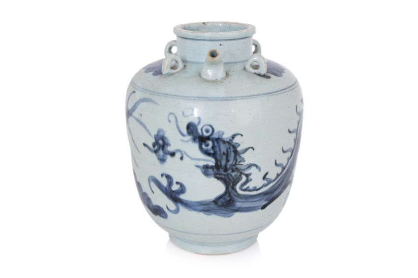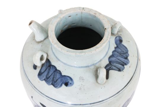 Ovoid jar covered in pale blue glaze decorated in a continuous flying dragon, four lugs to shoulders and engraved two character inscription, narrow bent spout and wide mouth, glazed to base and unglazed foot showing a porcelain biscuit, circa 16th century