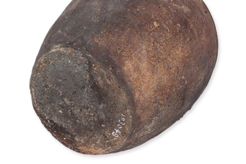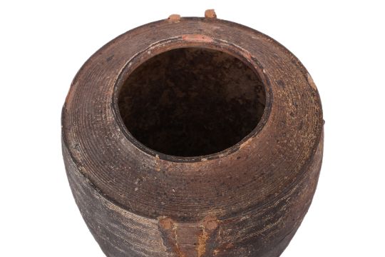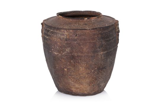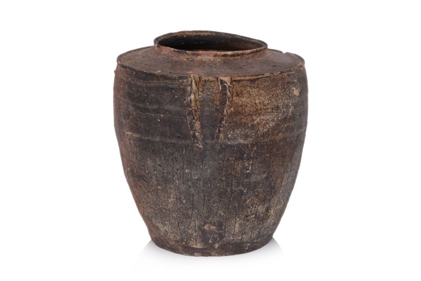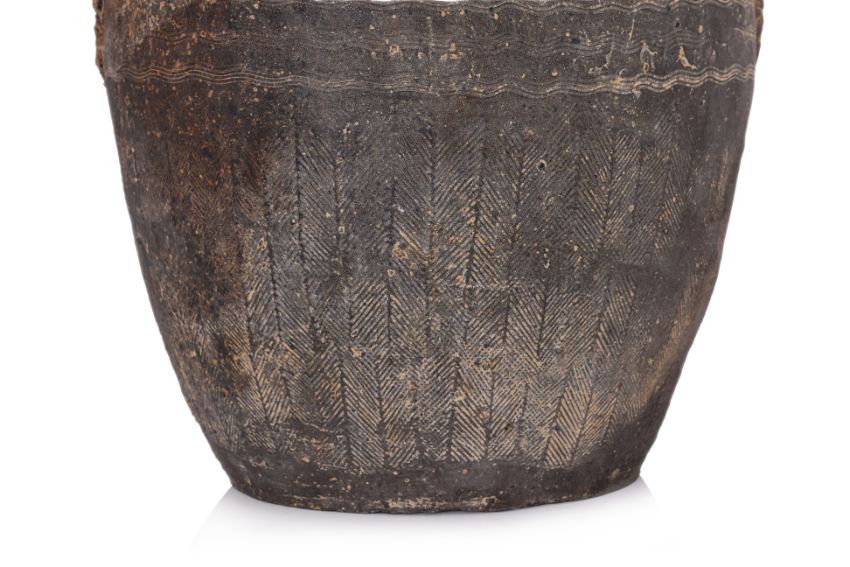 Ovoid stoneware jar decorated with combed bands and impressed pattern, likely Eastern Han dynasty