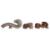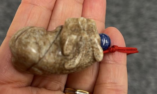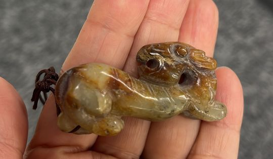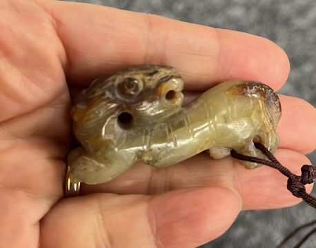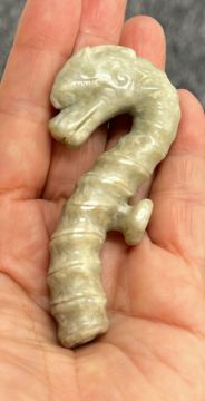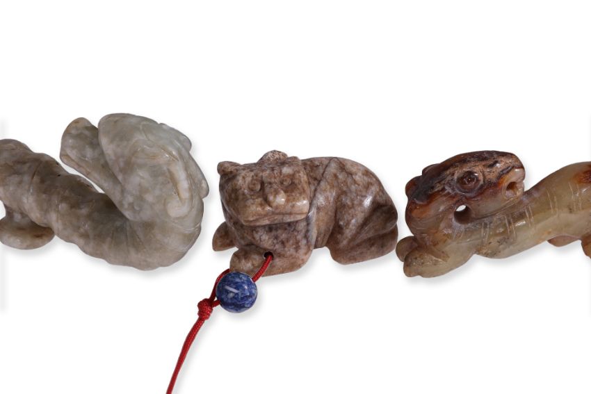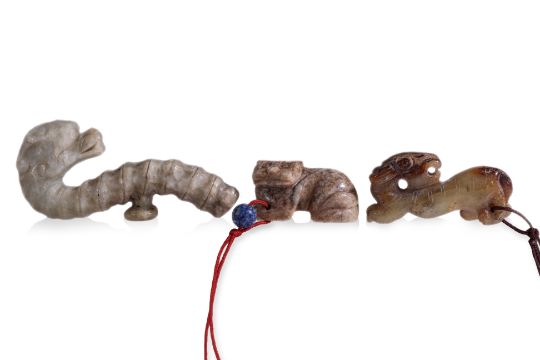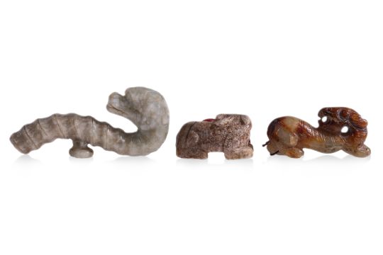 Comprising a dragon form belt-hook, a celadon and russet toned recumbent beast, and a beige-toned model of a feline-like beast