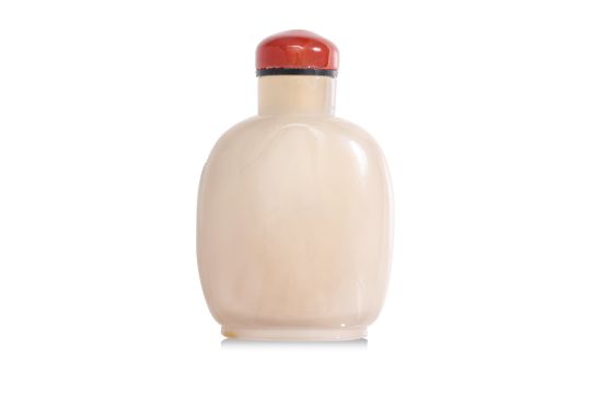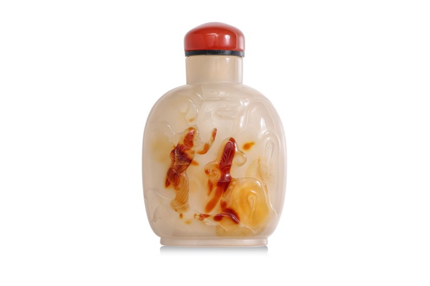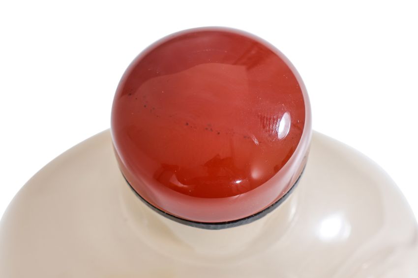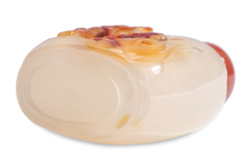 Transparent grey and russet-toned chalcedony modelled in compressed ovoid form, decorated in relief scene of figure beside a large lingzhi growing among rocks, carnelian stopper, probably 19th century
