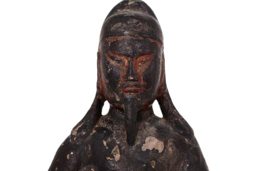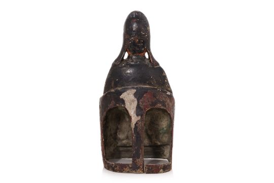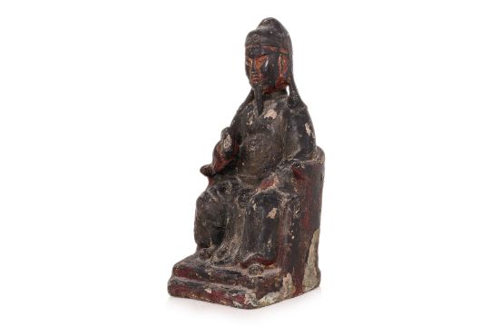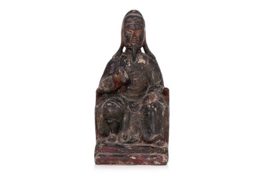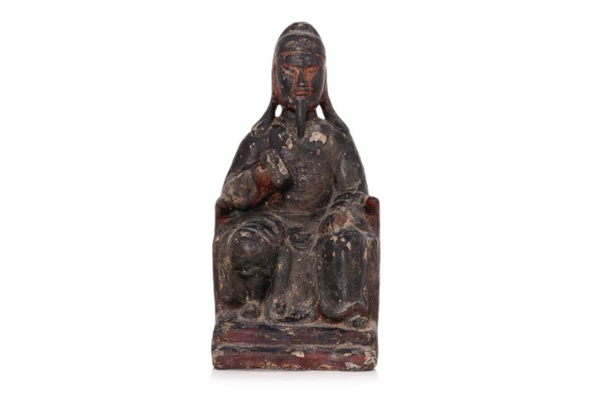Modelled seated on throne wearing robe and holding attribute in right hand, multiple extant layers of lacquer and traces of gilding, hollow cast with t-form brace to back, late Ming dynasty, 16th/17th century