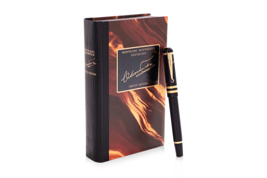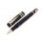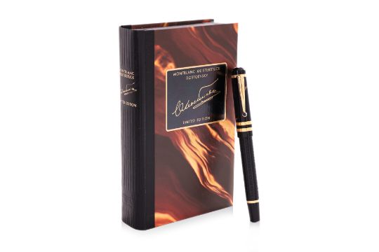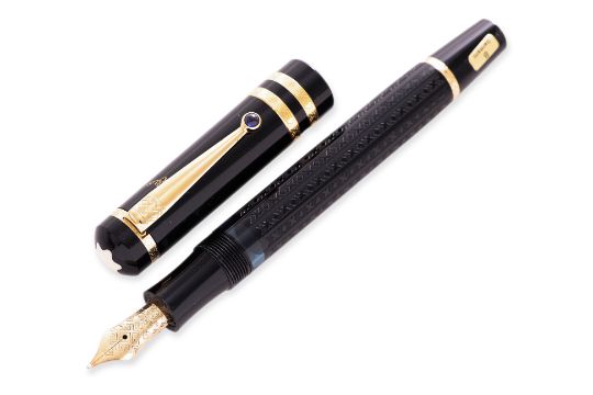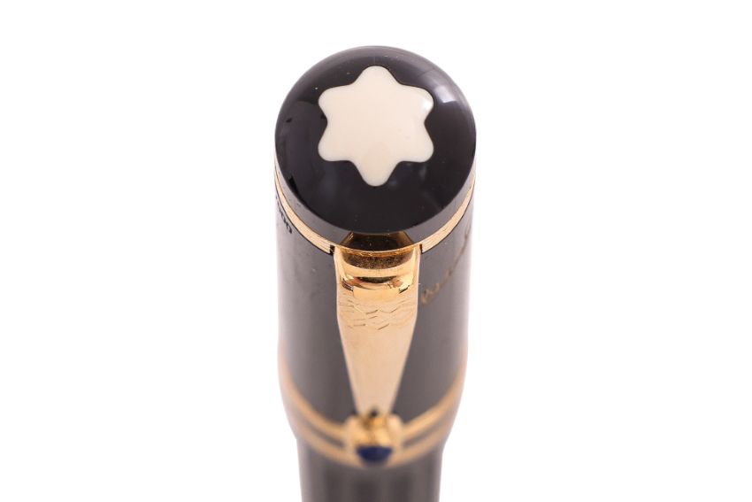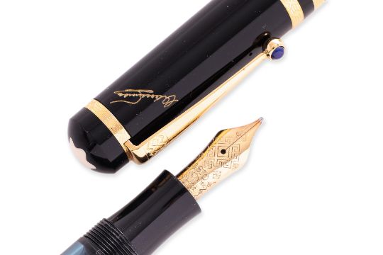 Writer's edition, black resin barrel with gilt detail, cabochon blue sapphire to clip, fine 18k gold nib, with outer box, inner box and booklet