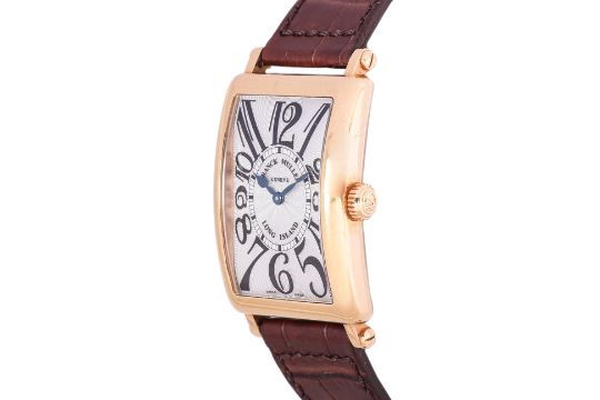 Silvered guilloche dial with black Arabic numerals, lustrous blue hands, quartz movement, in 18k yellow gold case, brown leather strap