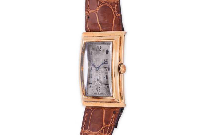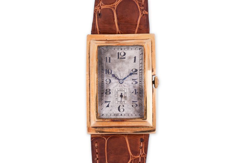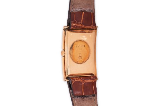 Curved rectangular 18K gold case, with Scottish import marks for Glasgow 1928, silvered guilloche dial with Arabic numerals and subsidiary seconds dial at 6 o'clock, Swiss 16 jewel manual wind movement, later leather strap