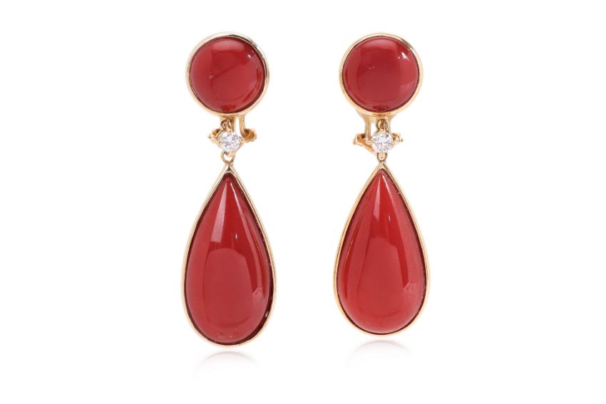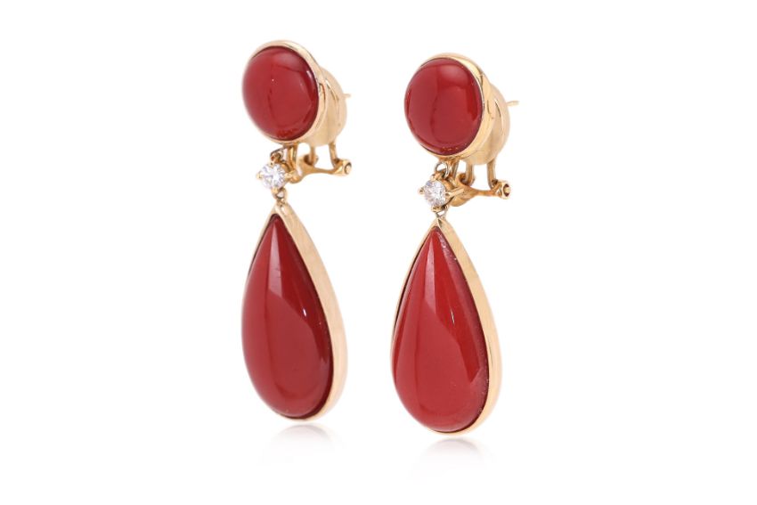 Featuring a pair of round coral cabochons measuring approximately 10mm each, and a pair of drop shaped coral cabochons measuring approximately 22.6 x 11.8mm each, accented by two round brilliant cut diamonds totalling approximately 0.20 Cts, all mounted in a yellow gold setting marked 'K18' for 18K.