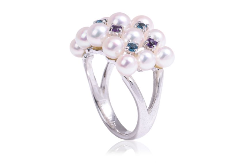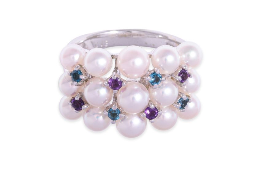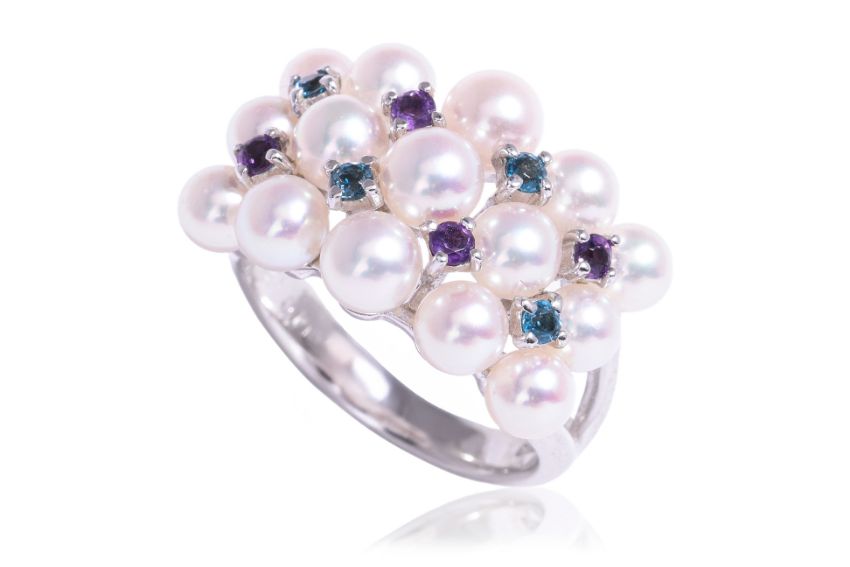 Featuring akoya cultured pearls measuring 4.0-5.0mm, mounted in a white gold setting marked 'K18WG' for 18K, accented with purple or blue gemstones, likely amethysts and blue zircons, weighing approximately 0.13 and 0.19 Cts (marked) respectively.