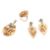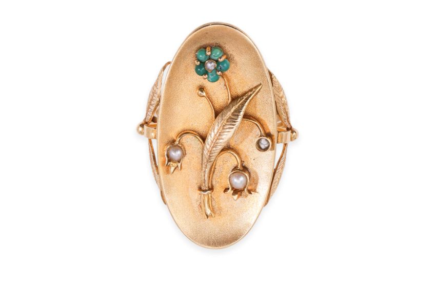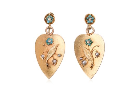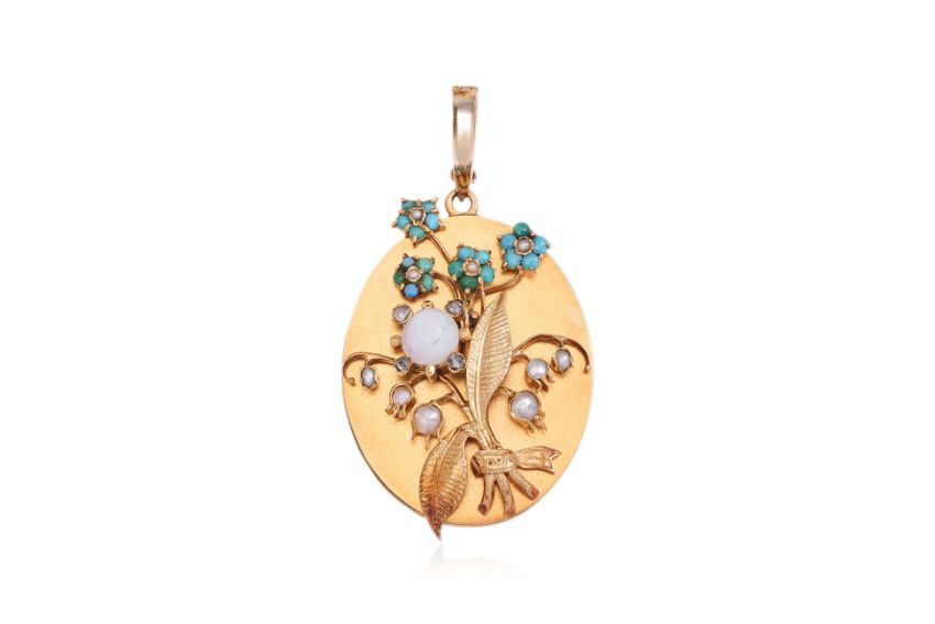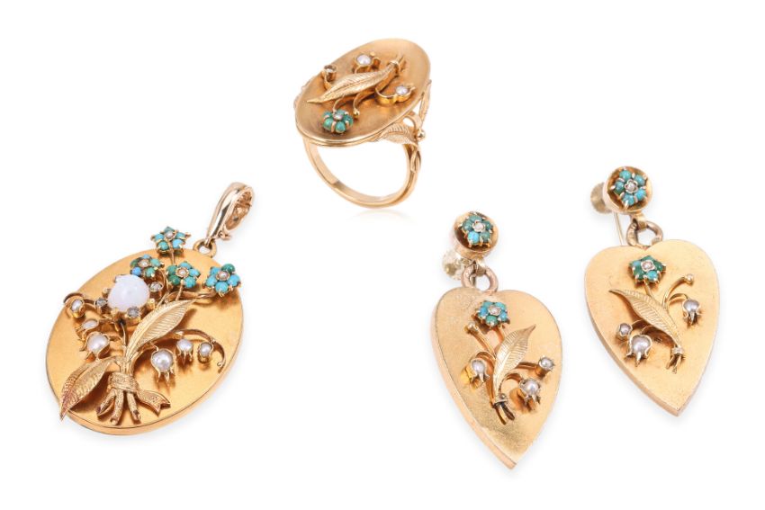 To include a pair of screw-back earrings, a ring and a pendant, each mounted in yellow gold, marked '750' for 18K to the ring, '585' for 14K to the bail of the pendant, earrings unmarked. Pendant accented with opal, turquoise, split pearls and diamond chips, all in a floral style setting, earrings and ring similarly styled, with turquoise, split pearls and diamond chips.