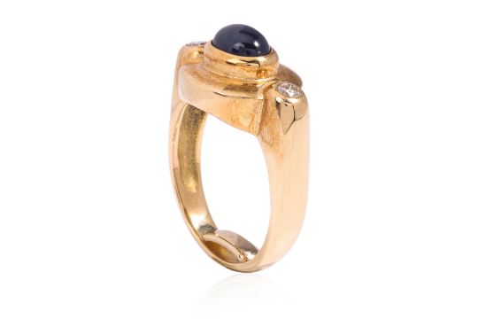 Featuring a cabochon sapphire weighing approximately 1.00 Cts, mounted in a yellow gold setting marked '750' for 18K, accented with round brilliant cut diamonds totalling approximately 0.12 Cts.