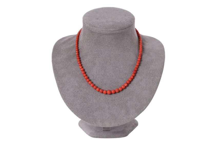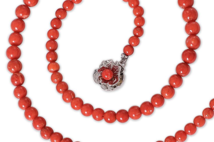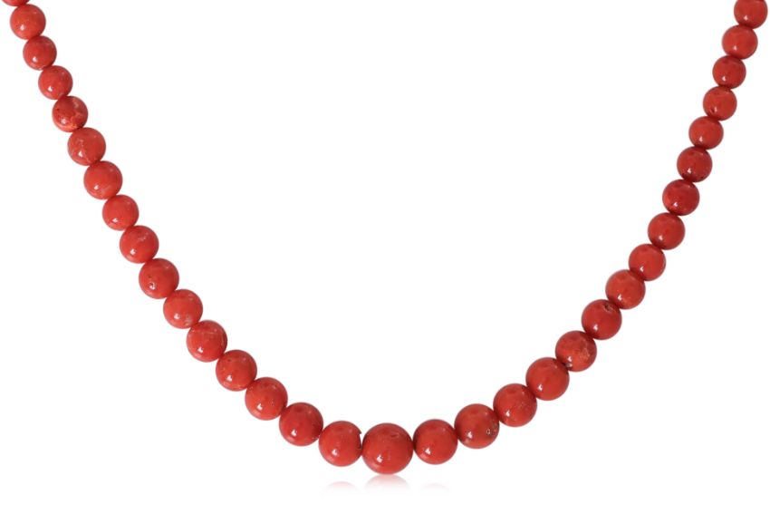 Featuring coral beads measuring approximately 4.0-7.3mm, mounted to a silver clasp marked 'silver'.