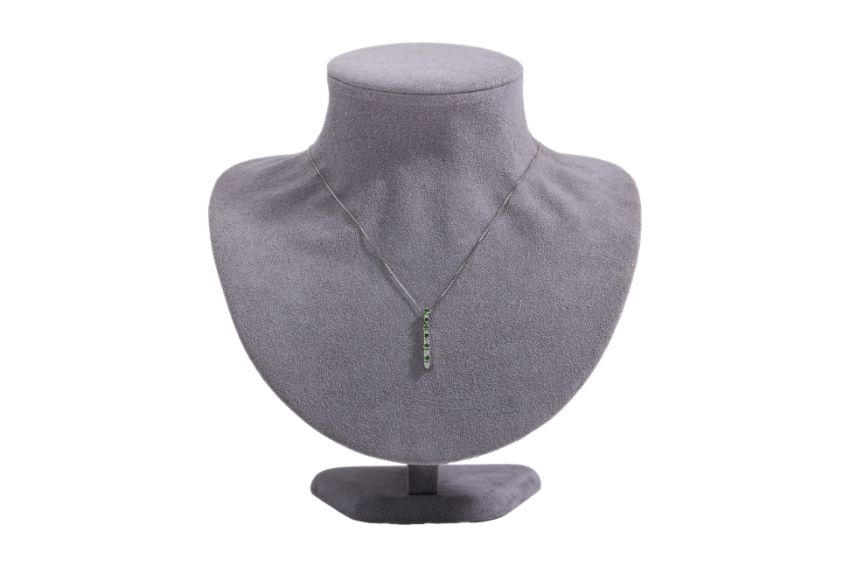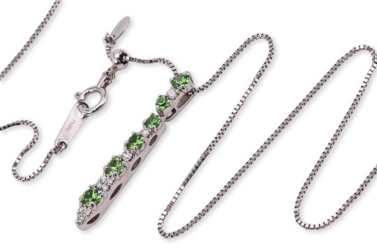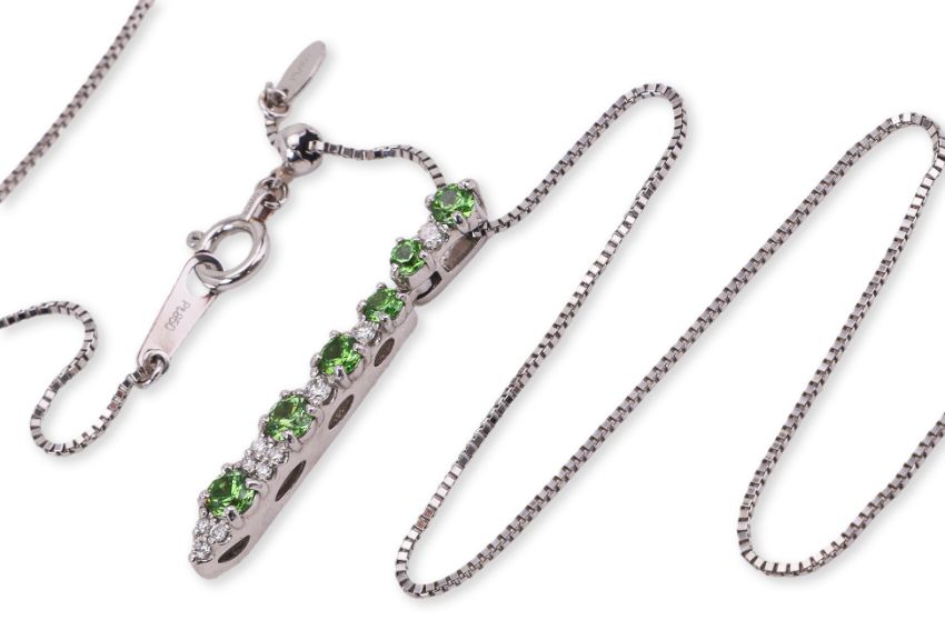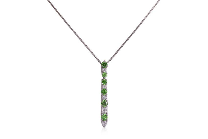 Featuring round brilliant cut tsavorite garnets totalling approximately 0.45 Cts (marked), mounted in a platinum setting marked 'Pt900', accented with round brilliant cut diamonds totalling approximately 0.09 Cts (marked). Accompanied with an adjustable platinum box chain marked 'Pt850'.