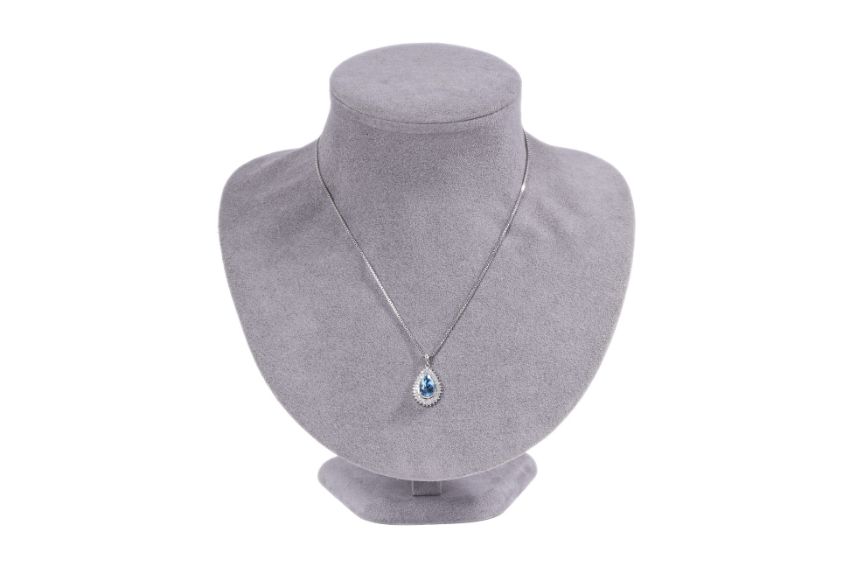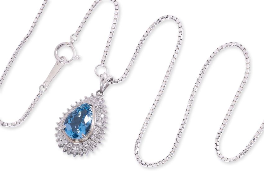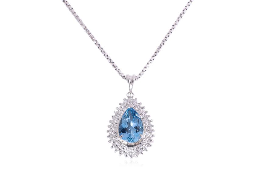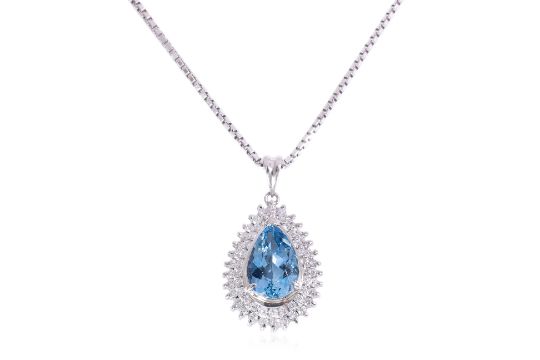 Featuring a pear shaped aquamarine weighing approximately 1.89 Cts (marked), mounted in a platinum setting marked 'Pt900', accented with round brilliant cut diamonds totalling approximately 0.43 Cts (marked). Accompanied with a platinum box chain marked 'Pt850', signed 'La Soma'.