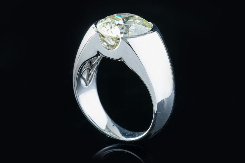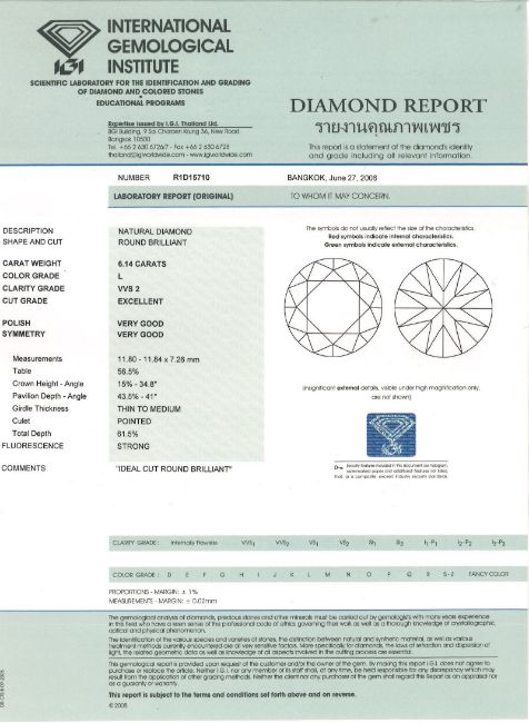 Featuring a large round brilliant cut diamond weighing approximately 6.14 Cts, mounted in a white metal setting, likely white gold. Accompanied with Nan Yang Gemological Institute Report No. 16829718 dated April 30, 2025, stating that the very light yellow natural diamond is of O to P colour, VS1 clarity, with excellent polish and symmetry, of strong blue fluorescence. Accompanied with an earlier report by International Gemological Institute dated June 27, 2006, stating that the diamond is of L colour, VVS2 clarity.