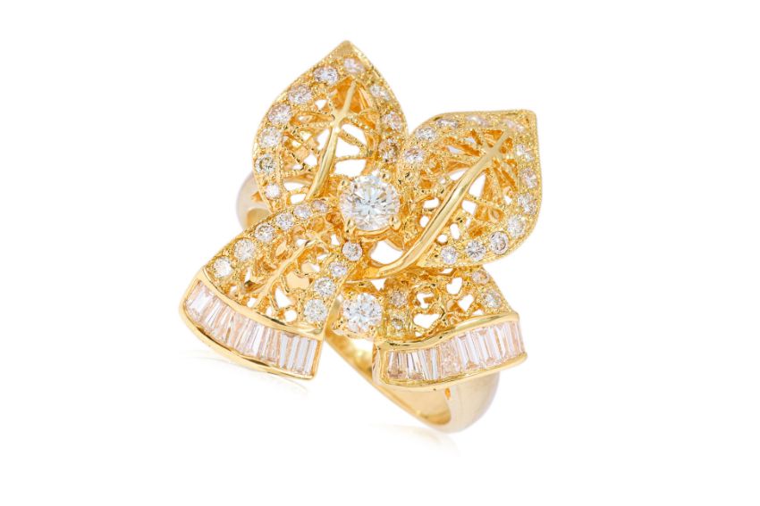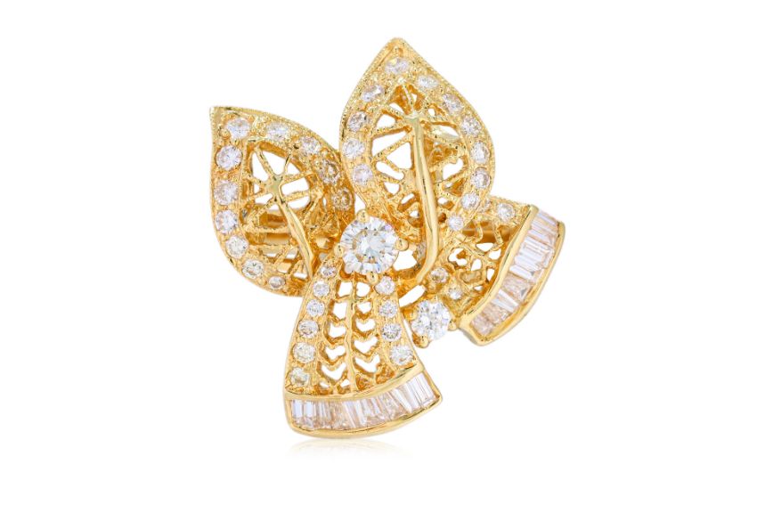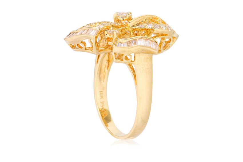 Featuring a round brilliant cut diamond weighing approximately 0.12 Cts, mounted in a yellow gold setting marked '18K' '750', accented with round brilliant cut and tapered baguette cut diamonds totalling approximately 0.65 Cts.