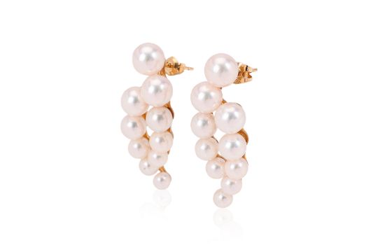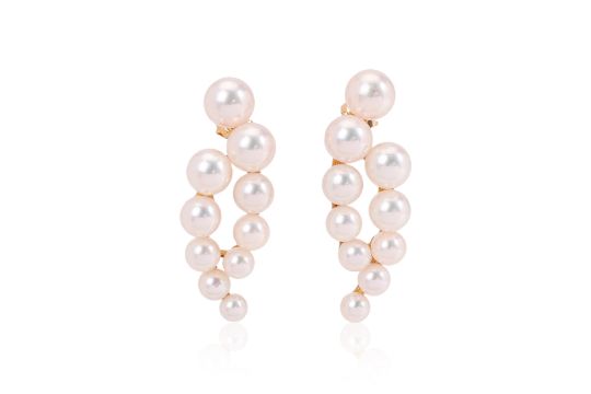 Featuring akoya cultured pearls measuring approximately 4.0-7.5mm, mounted in a yellow gold setting marked 'K18' for 18K.