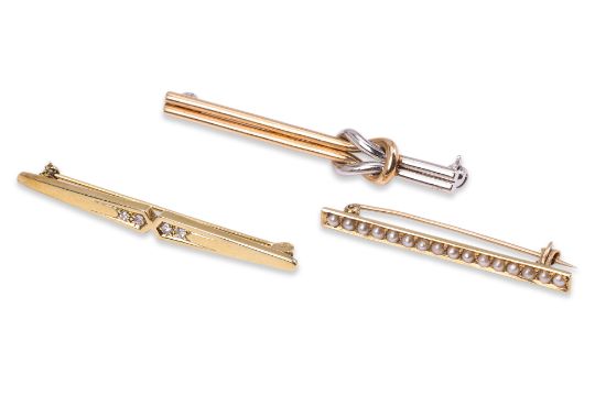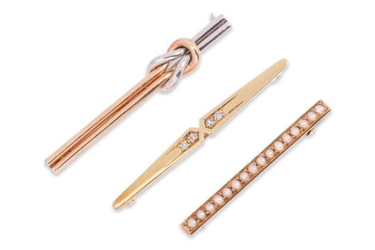 To include a two tone gold sample, marked '585' for 14K, a seed split pearl sample mounted in yellow gold setting marked '14K', and an unmarked yellow gold sample accented with round single cut diamonds totalling approximately 0.06 Cts.