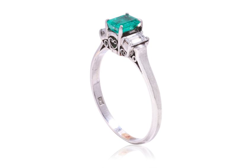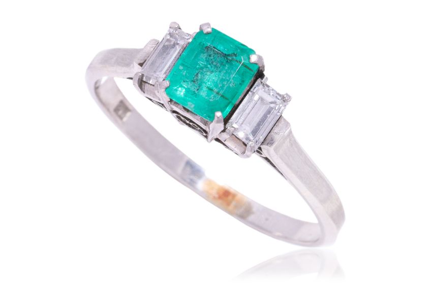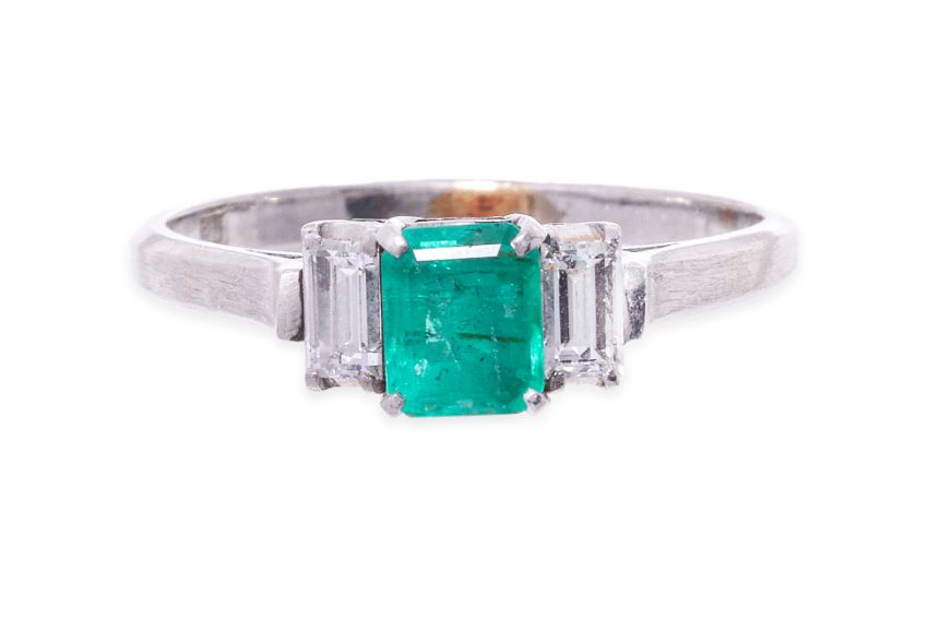 Featuring an emerald cut emerald weighing approximately 0.55 Cts, mounted in a platinum setting marked 'PM', flanked by two baguette cut diamonds totalling approximately 0.30 Cts.